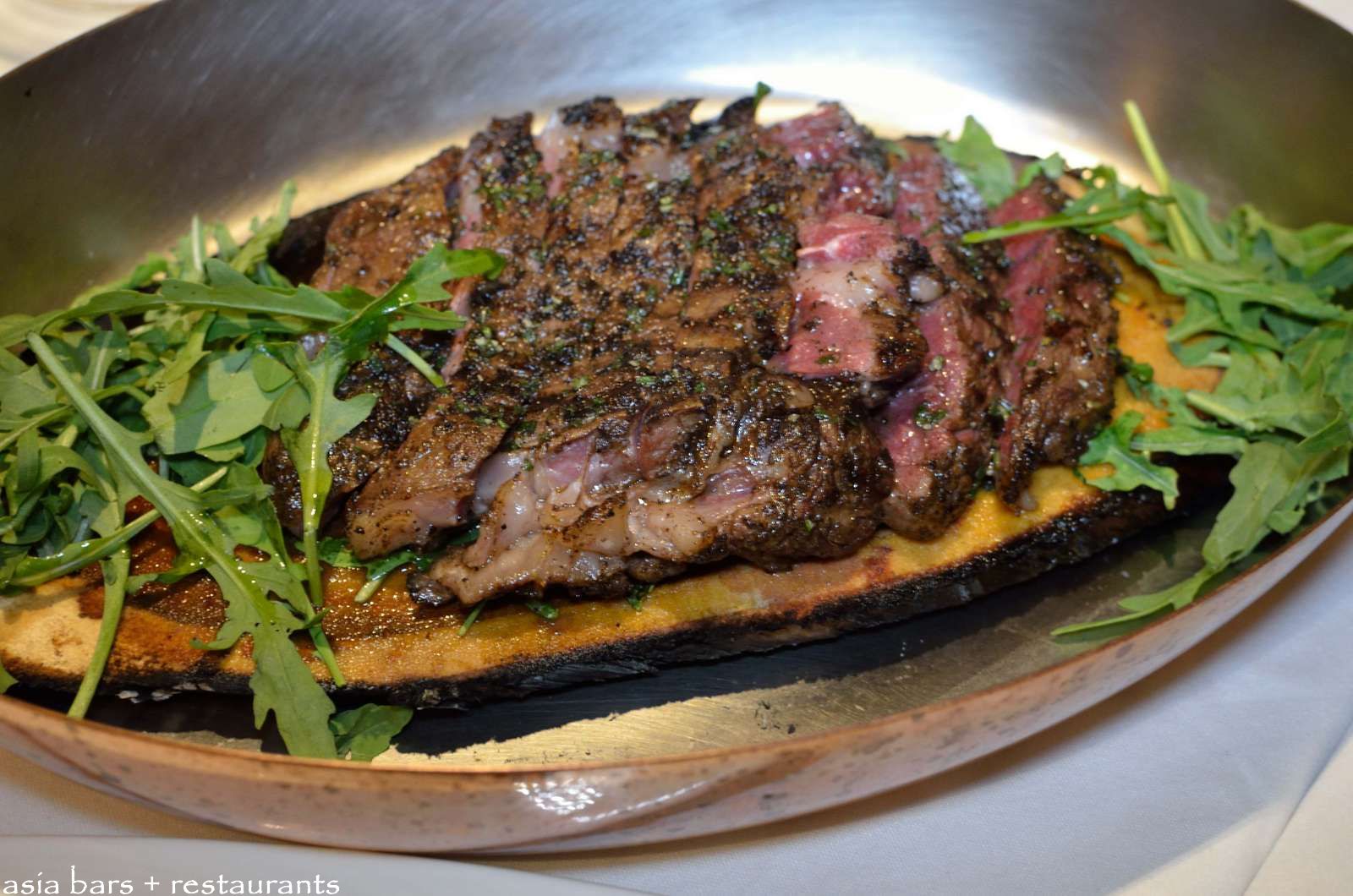 Bistecca- Grilled Texan Rib-Eye, flavored mushrooms and truffle mustard sauce. Served on a cedar slab to impart a subtle smoked aroma.