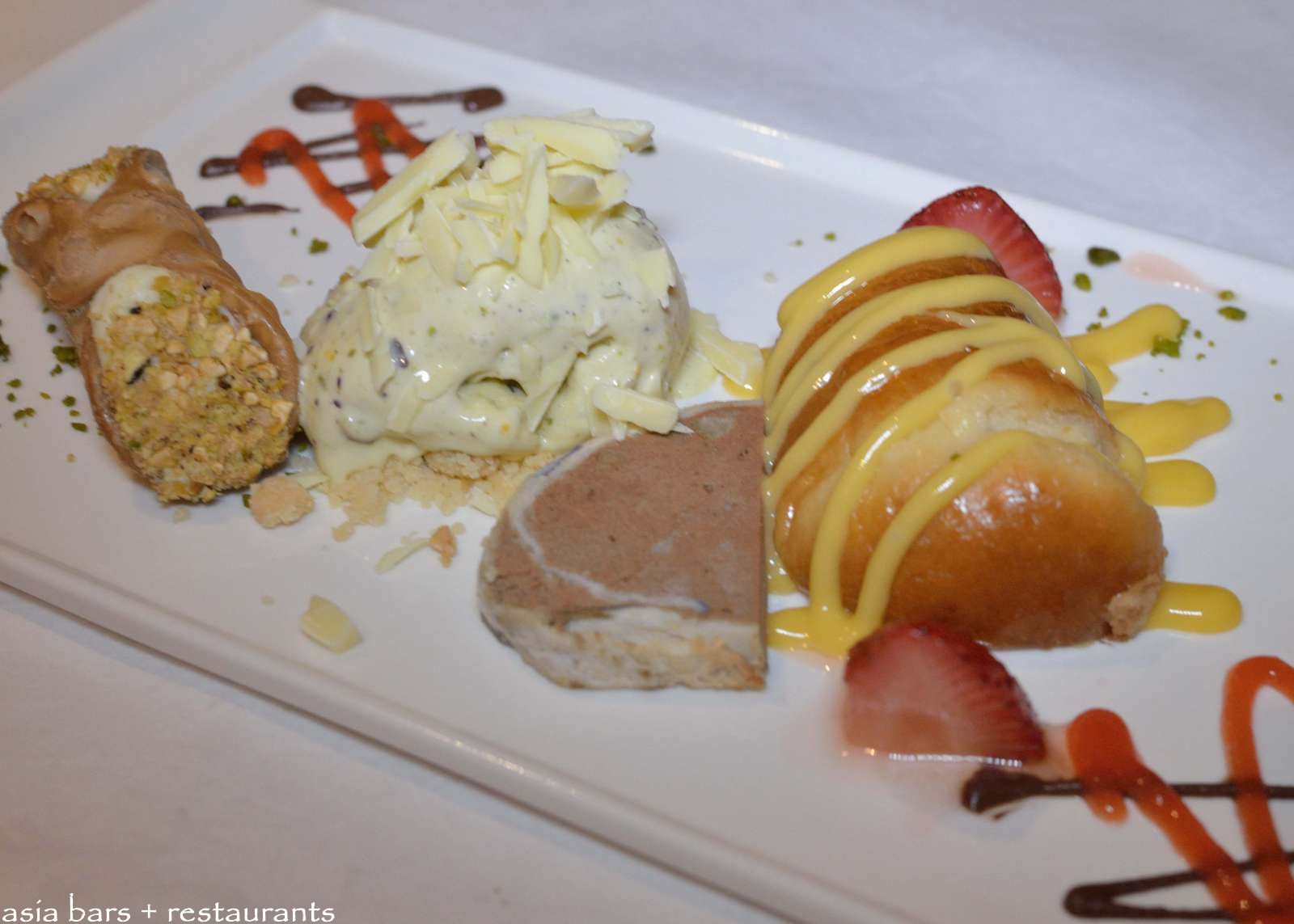 Gran Dessert- Zabaione- Zibibbo Sabayon served with marinated strawberries and traditional Baba; Cannolo & Cassata– Sicilian Cannoli & Ice Cream with chocolate chips; Ricotta Cheese and candied fruits.