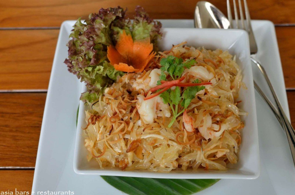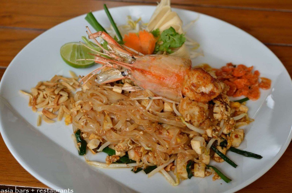 Phad Thai- Wok-fried rice noodles with blue river prawns and Chinese chives complemented with banana blossom and bean sprouts.