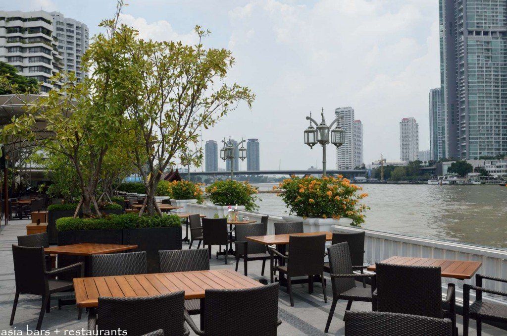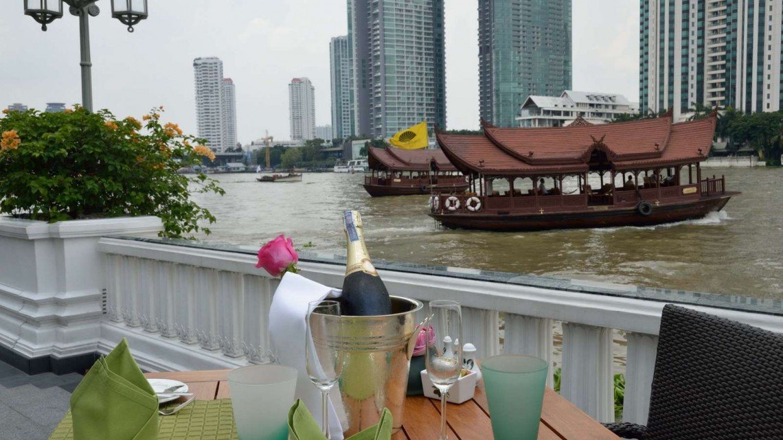 Tables on all sections of The Verandah terrace enjoy wonderful views across the Chao Phraya River.