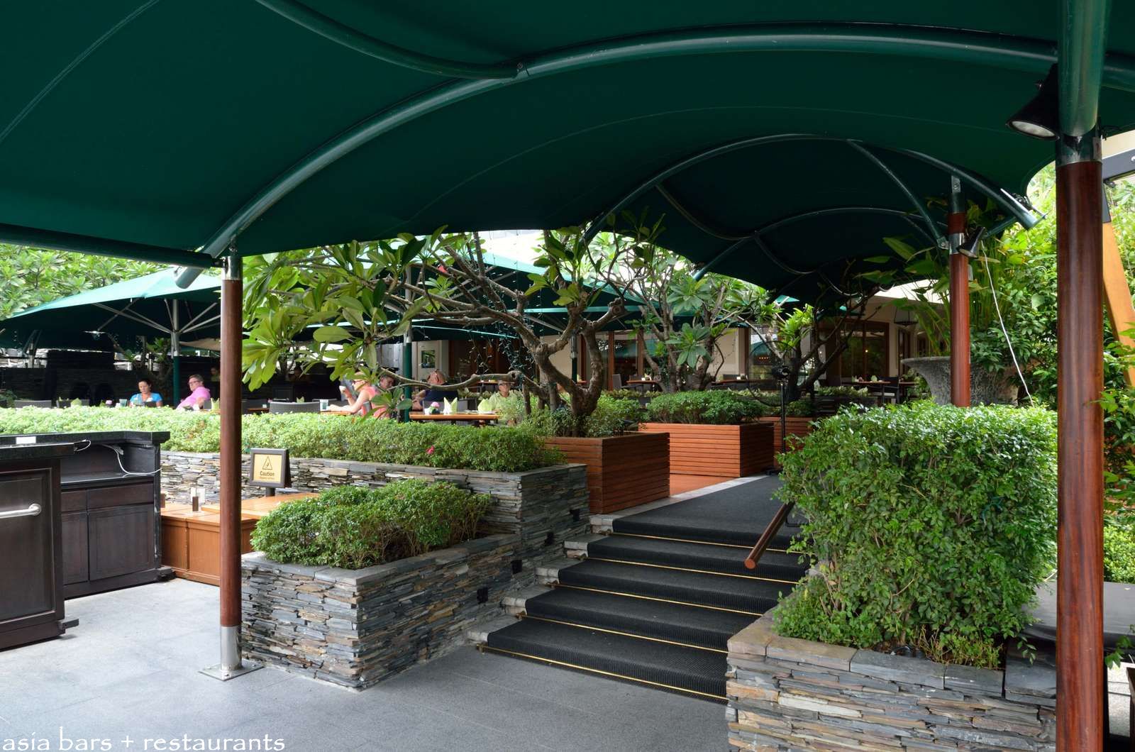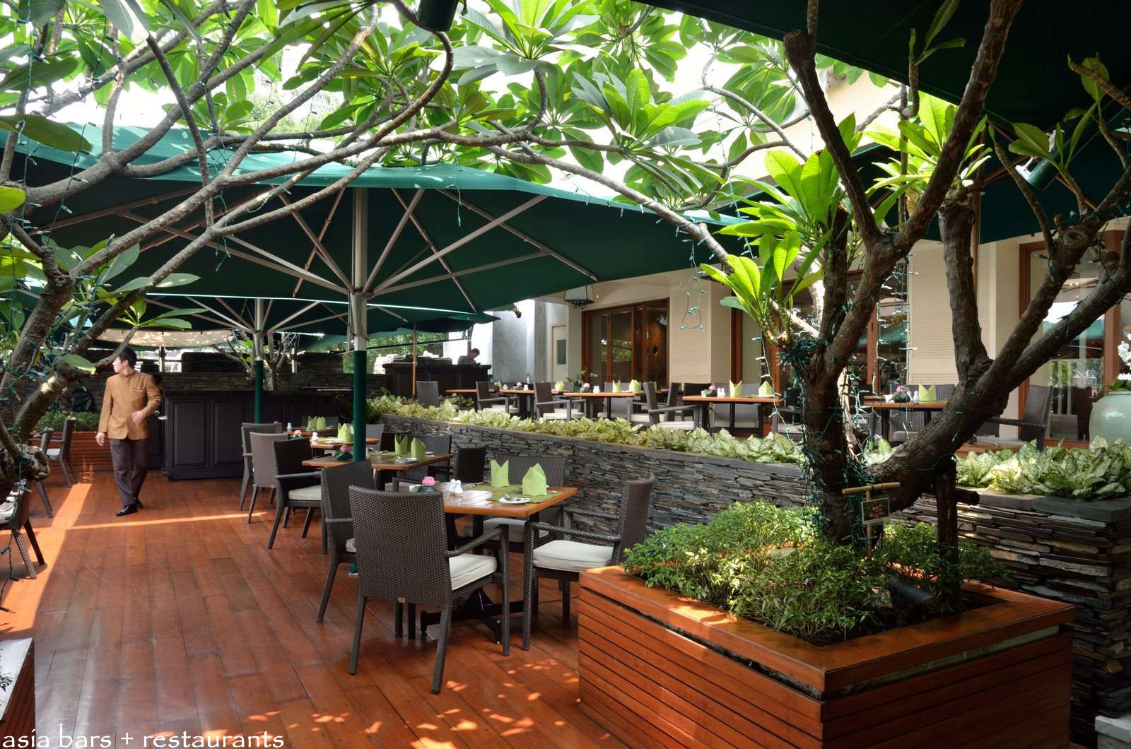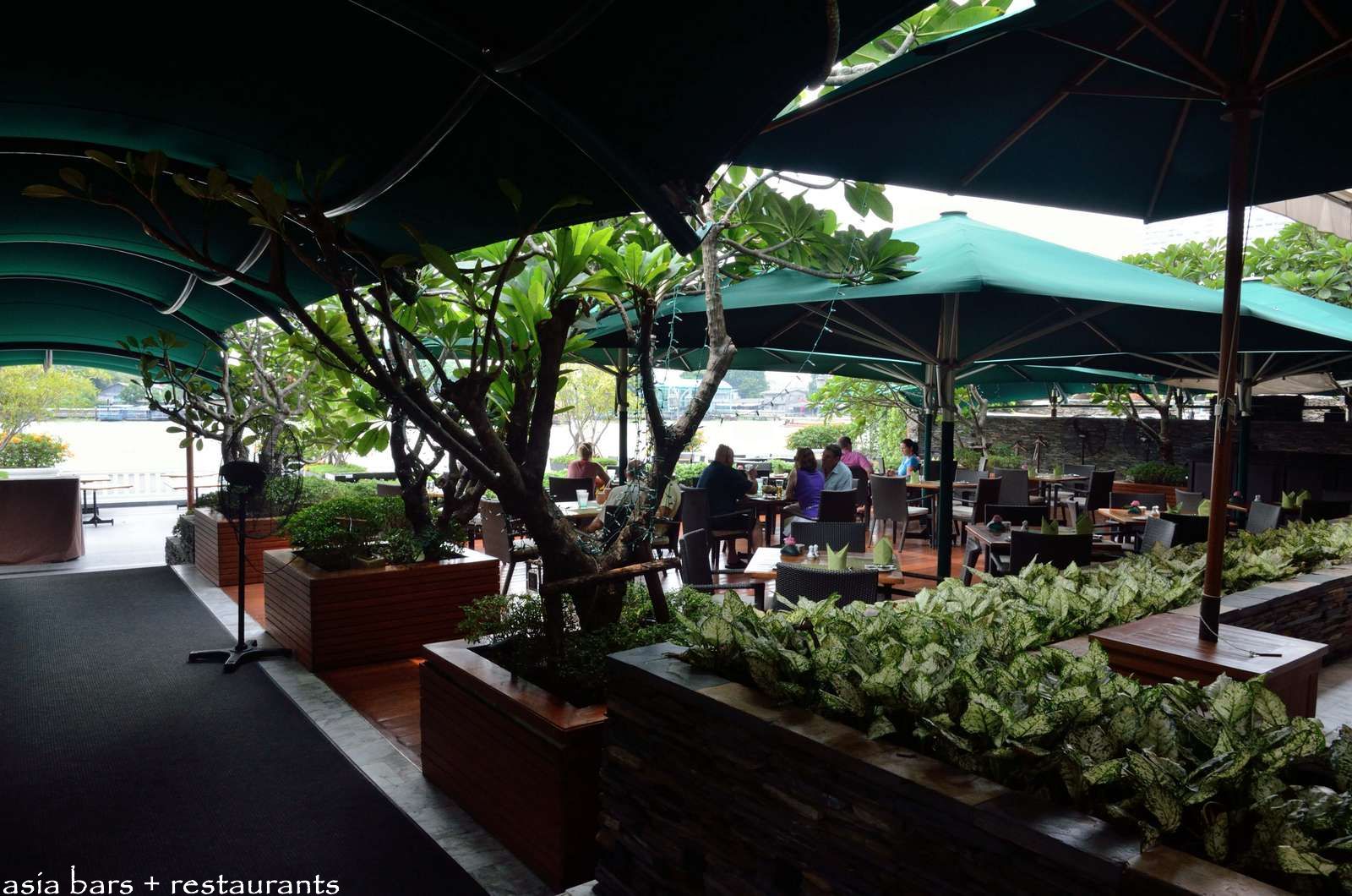 The expansive outdoor terrace at The Verandah- comfortably shaded by trees and awnings- extends across three levels- extending down from the main hotel building to the riverfront.