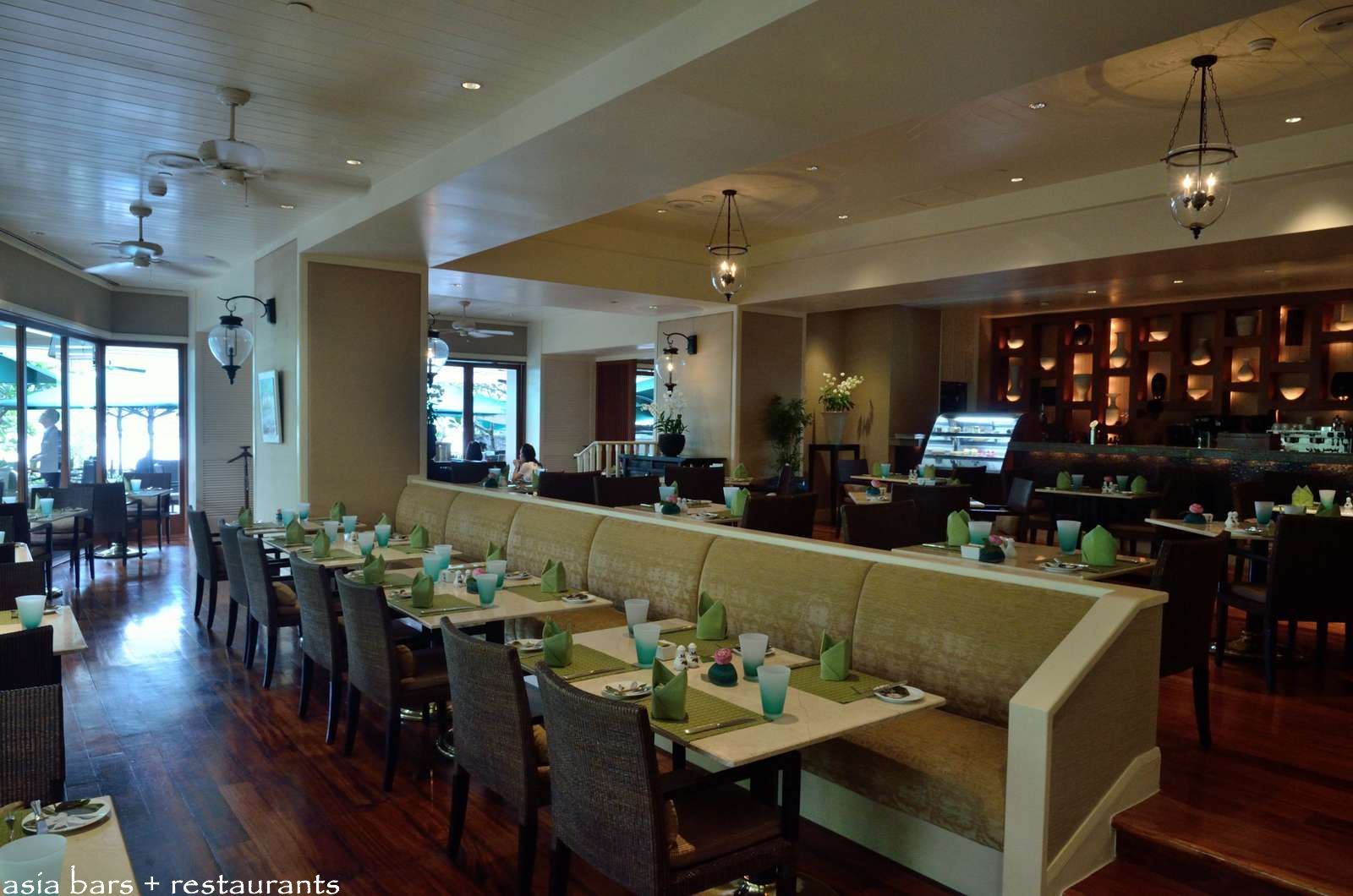 An elegant series of banquette settings separate upper and lower levels of the interior dining room.