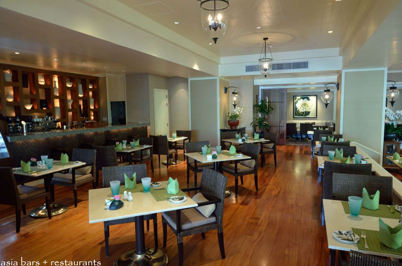 The interior dining area features generously spaced tables, with a comfortably warm palette of natural timber flooring, and shades of beige and brown exuding an atmosphere of understated sophistication.