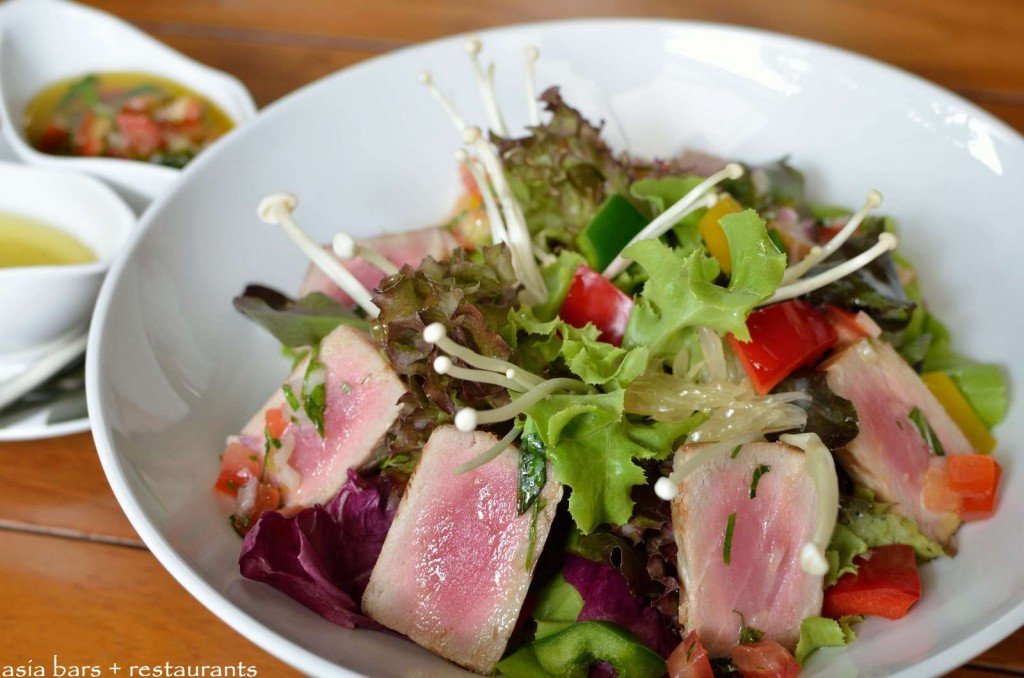 Healthy salad- Assorted leaves, pomelo, enoki mushrooms diced capsicum extra virgin olive oil and lime dressing. Option to add either rare seared tuna fillet and tomato-basil salsa, or roasted white prawn with Cajun spices.