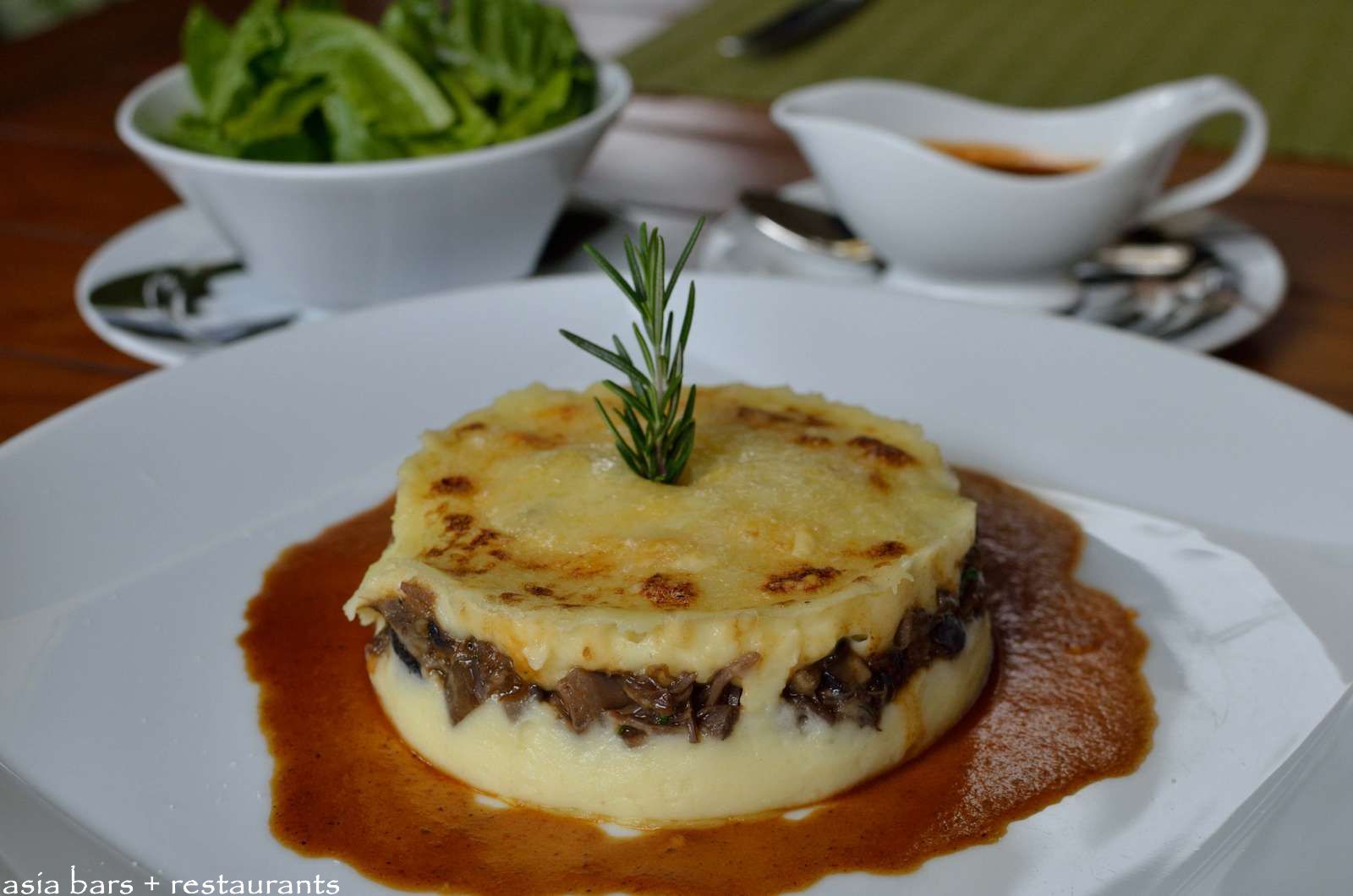 Duck ‘Parmentier’- Slowly cooked braised duck leg layered with fluffy mashed potatoes, fresh market mushroom, bouquet of salad greens.