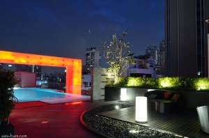 (L) The roof top terrace deck with comfortable lounge settings- pool and iconic lighting installation in background.