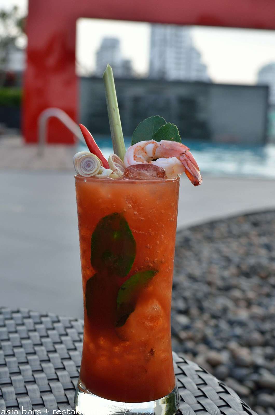 Bloody Tom Yum Goong- Vodka, tomato juice, Tabasco, Worcestershire sauce, salt & black pepper, lemongrass, chili, kaffir lime leaves, boiled shrimp.
