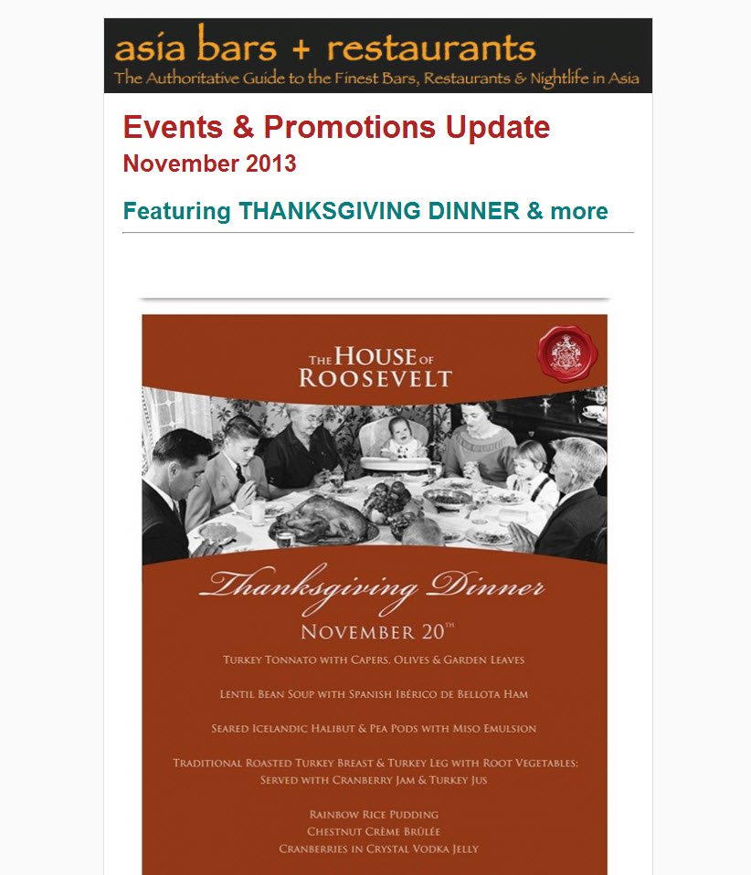 Asia Bars & Restaurants Newsletter- Events & Promotions- November 2013 Asia Bars & Restaurants Newsletter with highlighted Events & Promotions- November 2013 Click here to view the complete Newsletter Share article: Google Plus 0 Share 0 Tweet 0