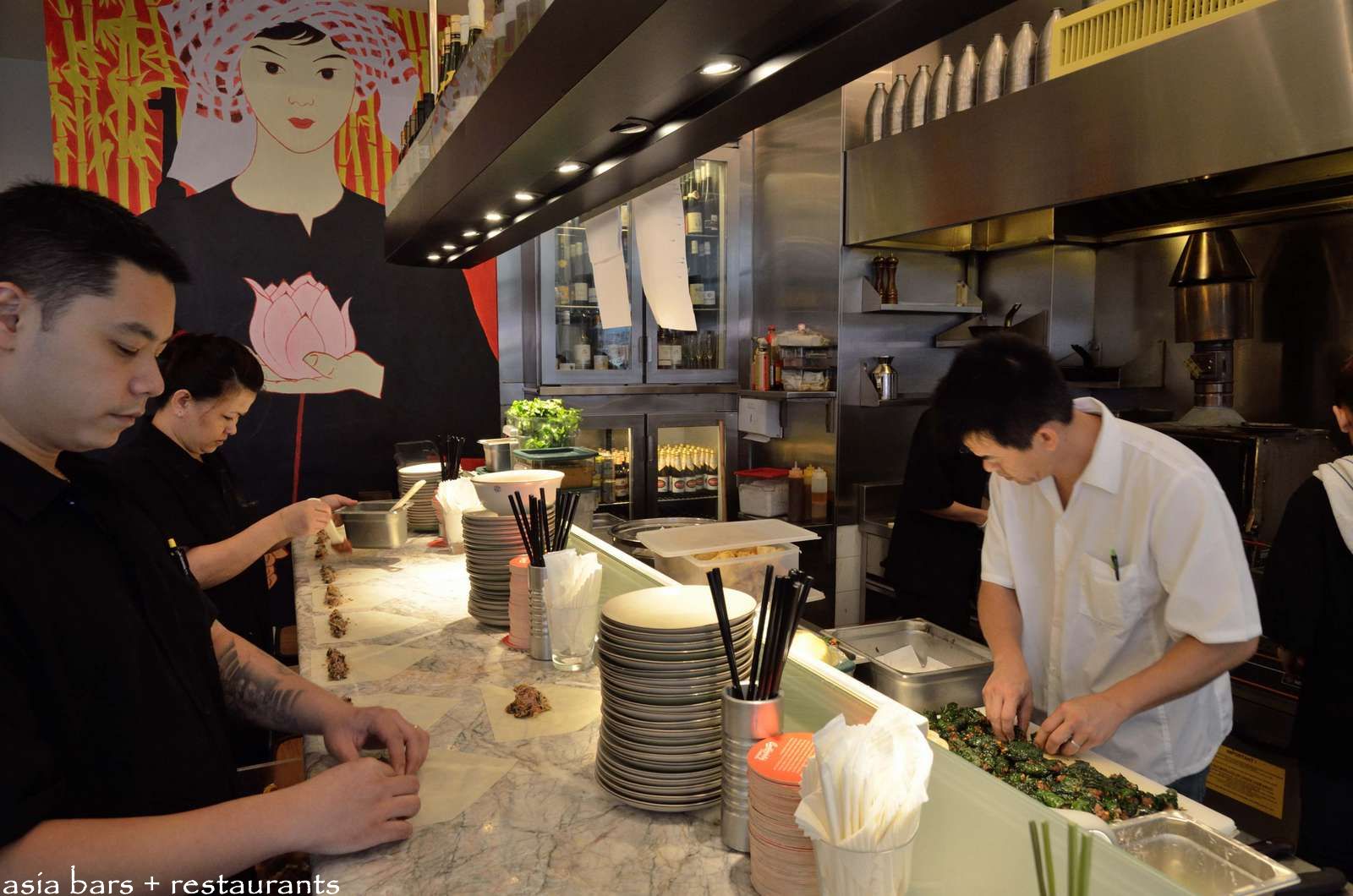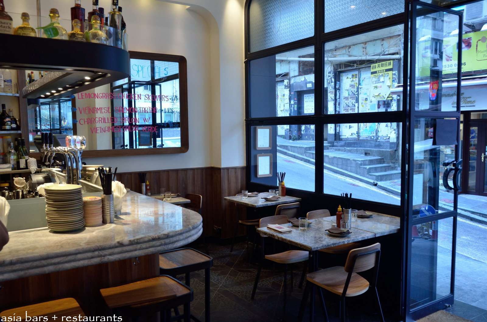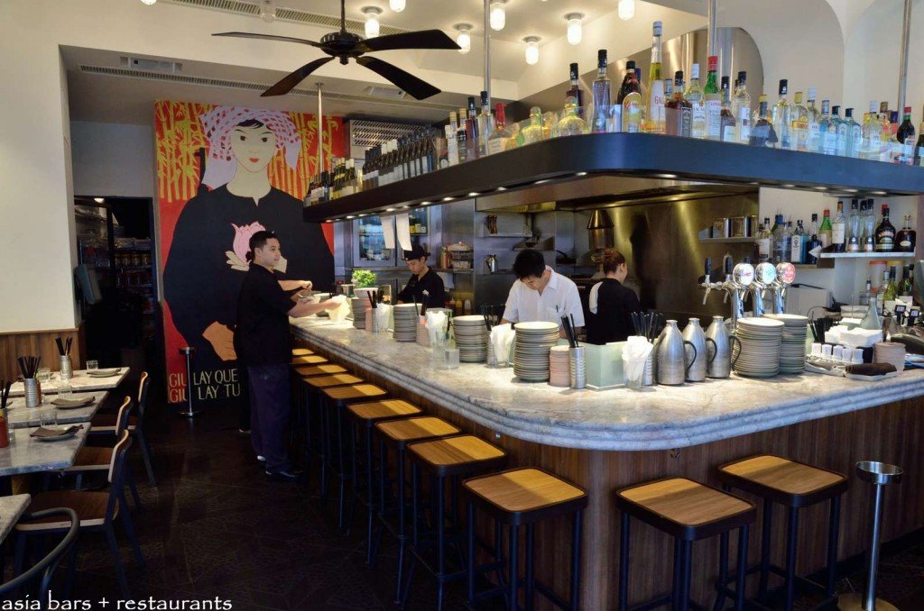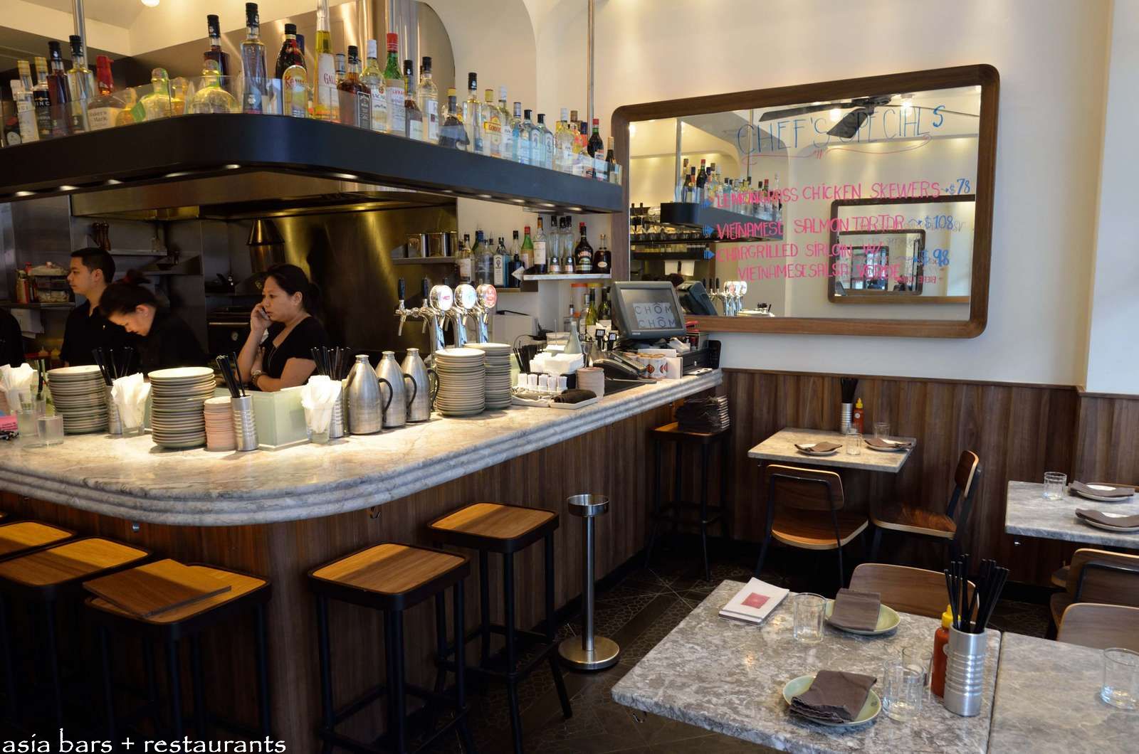 Front section of Chôm Chôm – the marble topped bar counter wraps around the open kitchen- several grey marble cafe tables occupy the compact space between the bar and front windows.