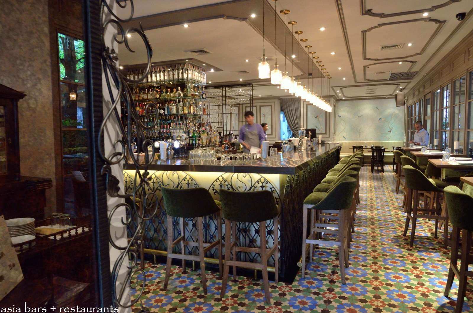 Sheathed in gleaming bronze, the bar counter evokes a glamorous luxe. Plushly upholstered bar chairs face the bar, and a series of window front high tables.
