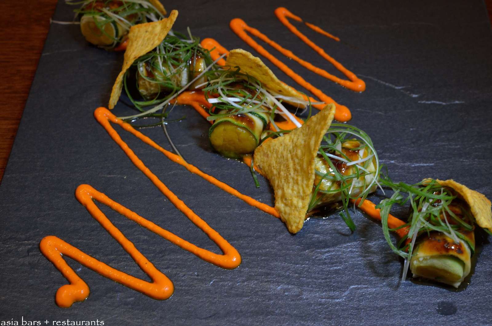 CARPACCIO DE CALABACIN CON CALABAZA ASADA Y SALSA DE PIMIENTOS DEL PIQUILLO- Zucchini carpaccio stuffed with pumpkin cream and roasted red bell pepper sauce. (Signature dish)