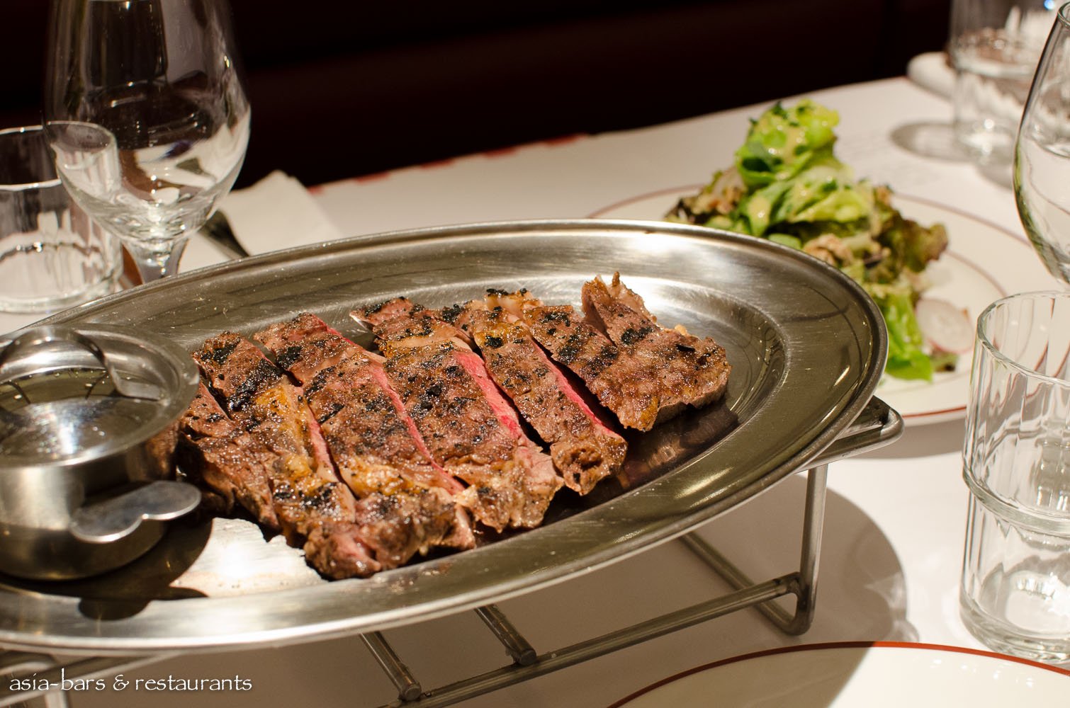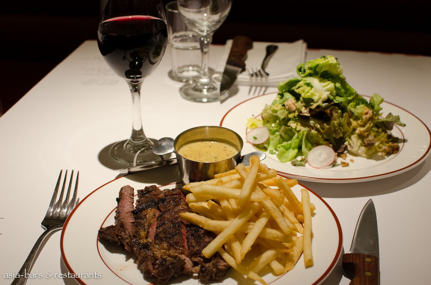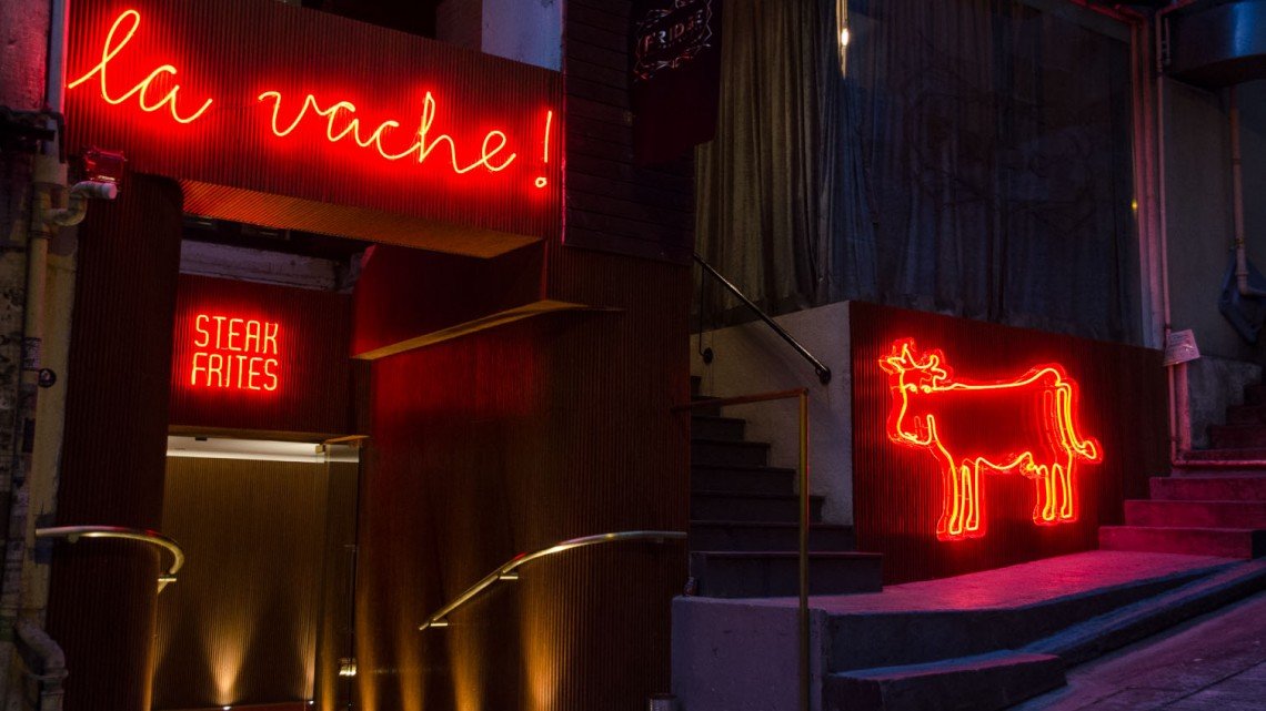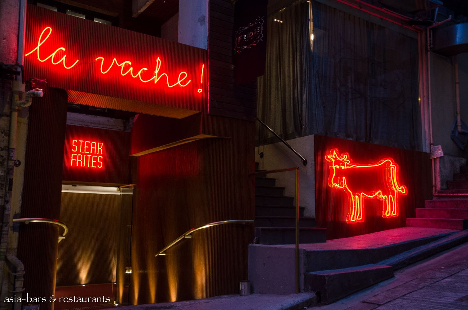 Taking inspiration from a concept that originally evolved in the 1930’s at traditional Parisian bistros, La Vache (French term for “holy cow”) introduces to Hong Kong diners for the first time a single main dish centric restaurant, with a menu choice of simply a fresh green salad followed by steak frites. The focussed approach at La Vache relies on serving up a consistently excellent, singular main dish- a generous cut of entrecote- cooked to the diner’s preference- and served with unlimited crisp fries. The only choices required from diners are what to drink – and a selection from the dessert cart. The intimately proportioned restaurant is well located within a lower ground floor space on the expanding fringe of Hong Kong’s bustling SOHO district- joining an increasingly vibrant neighbourhood of fashionable restaurants and bars. La Vache served its first steak frites in late October 2013- and with the concept being enthusiastically embraced by discerning Hong Kong diners- is fully booked most nights.
