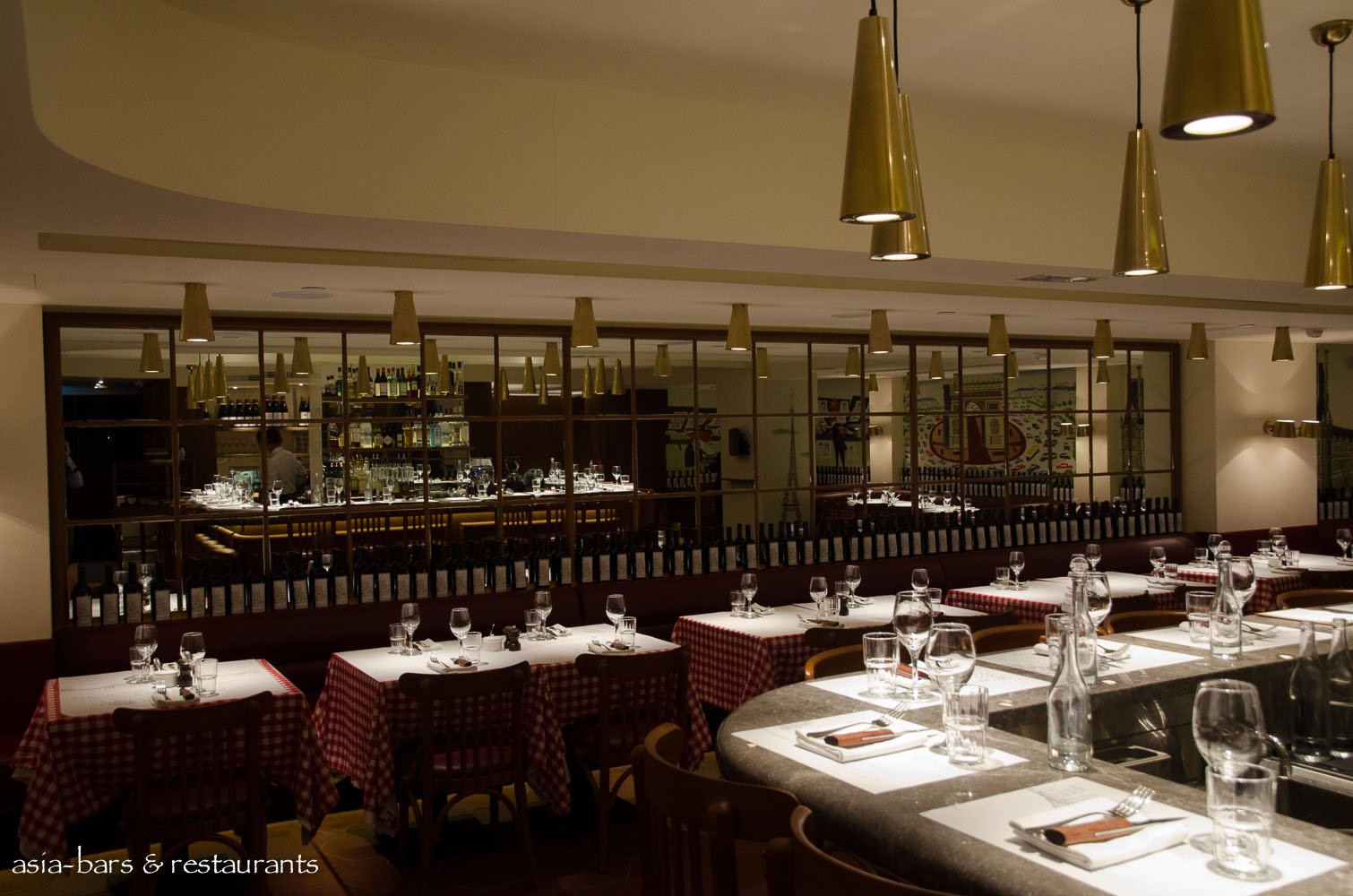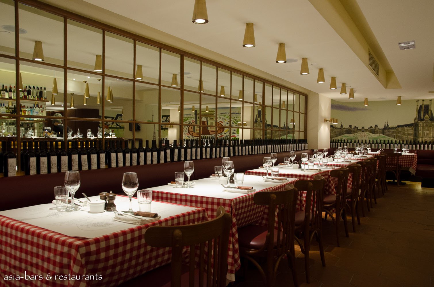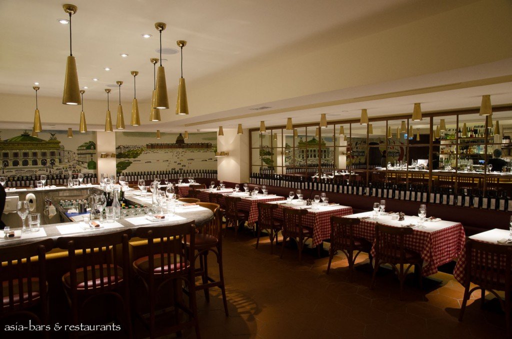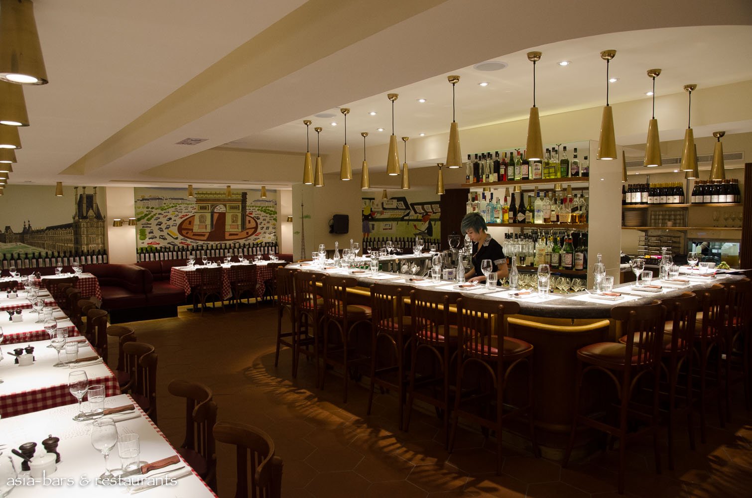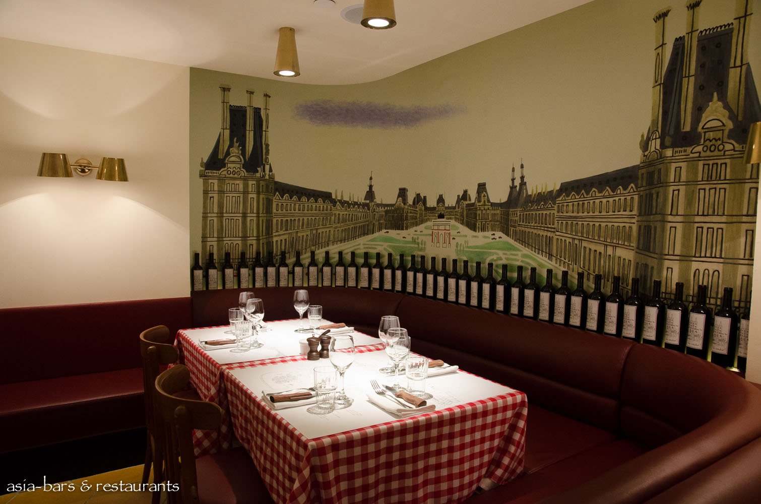 A series of red leather booth settings extend across both sides of the room- hand-painted murals of Parisian landmarks evoke the spirit of the French capitol.
