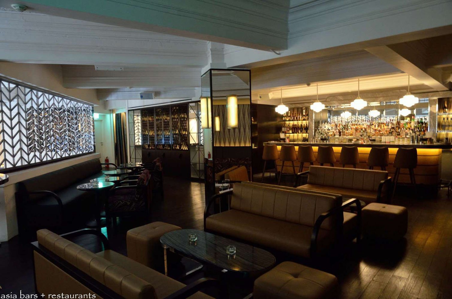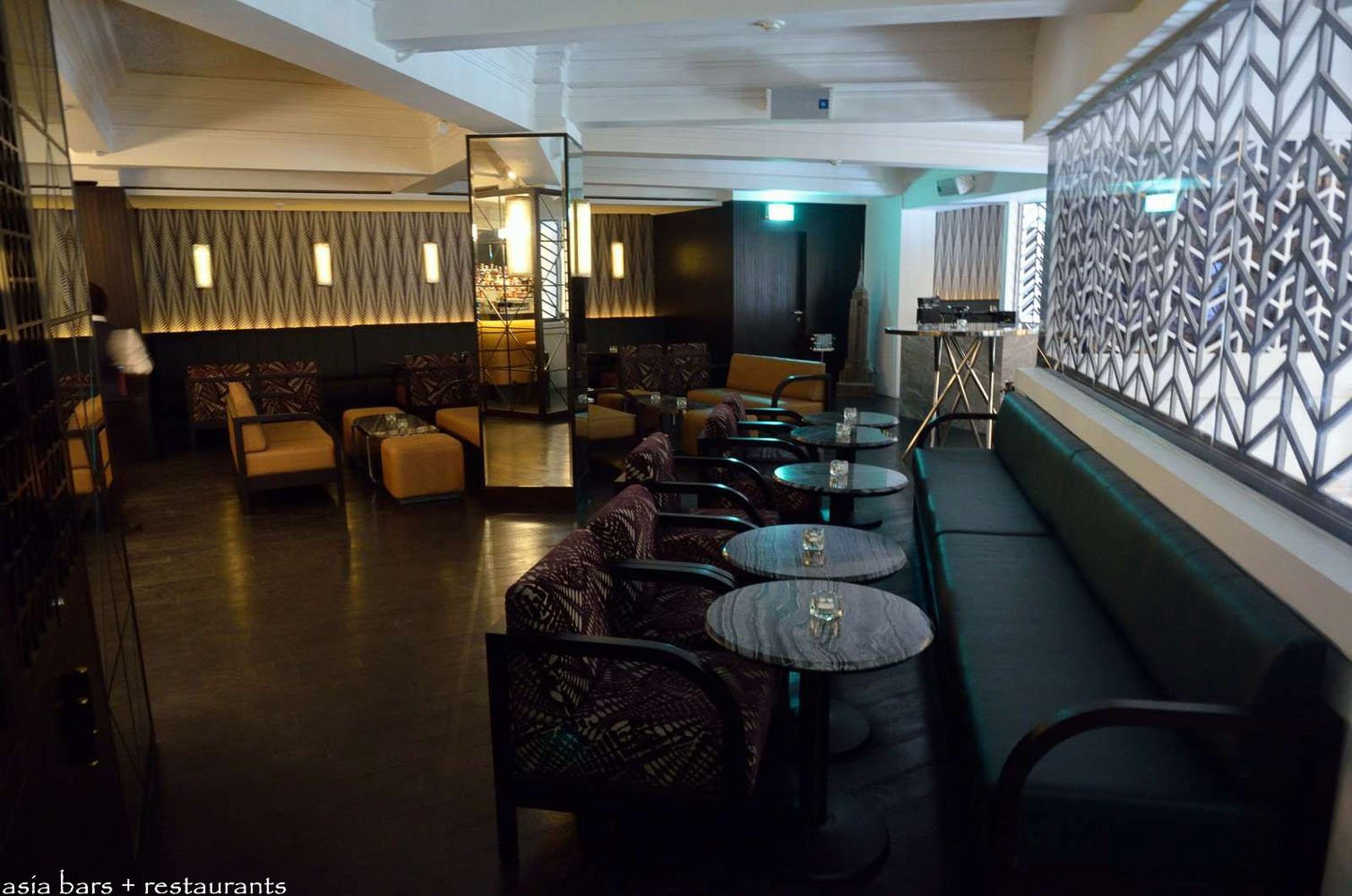 A separate upper level mezzanine space- The Powder Room- overlooks the ground floor chamber through bold, geometric-patterned screens.
