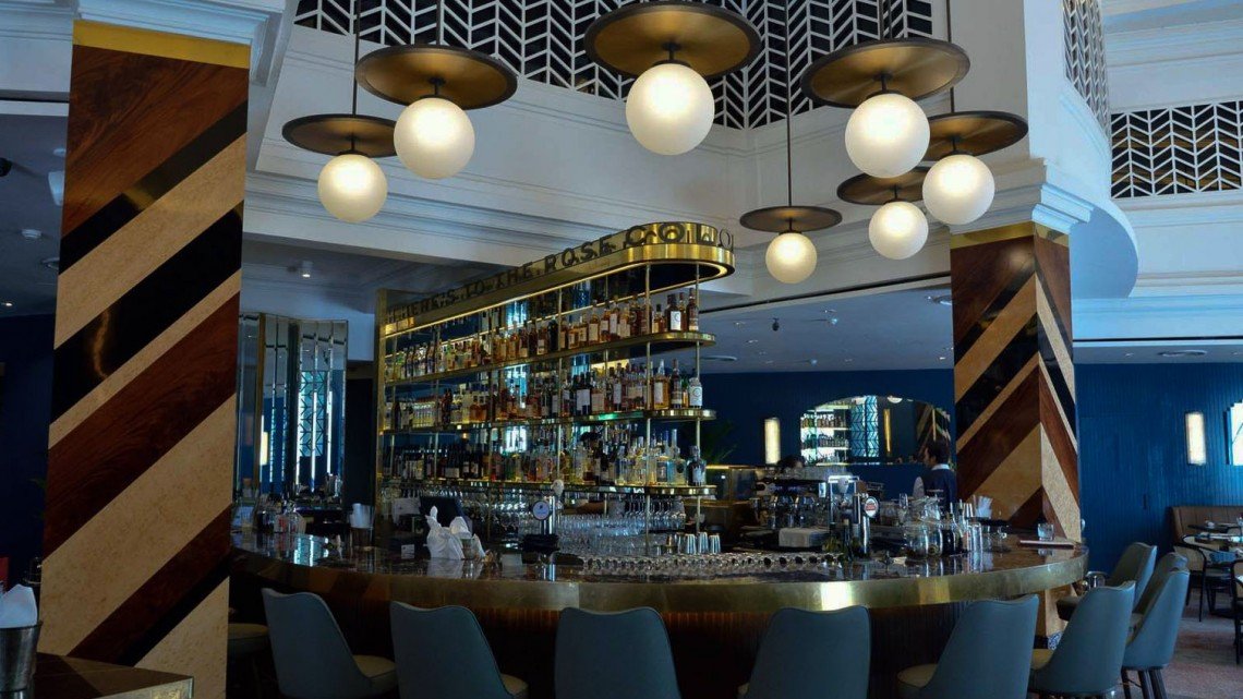 The impressive proportions and bold design of the original banking chamber have been transformed into a stunning dining and bar space. An attractive colour scheme, and exquisitely executed decor evoke the glamorous essence of the Art Deco period, exemplified by features such as the original terrazzo flooring, geometric decorative elements, and the sweeping curvature of the facade.