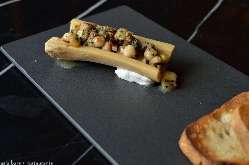Baked Bone Marrow, Chilli, Konbu Crostini.