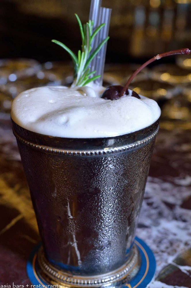 Silver Lining- combination of Amaretto and peaches shaken with egg white and garnished with a sprig of fresh rosemary.