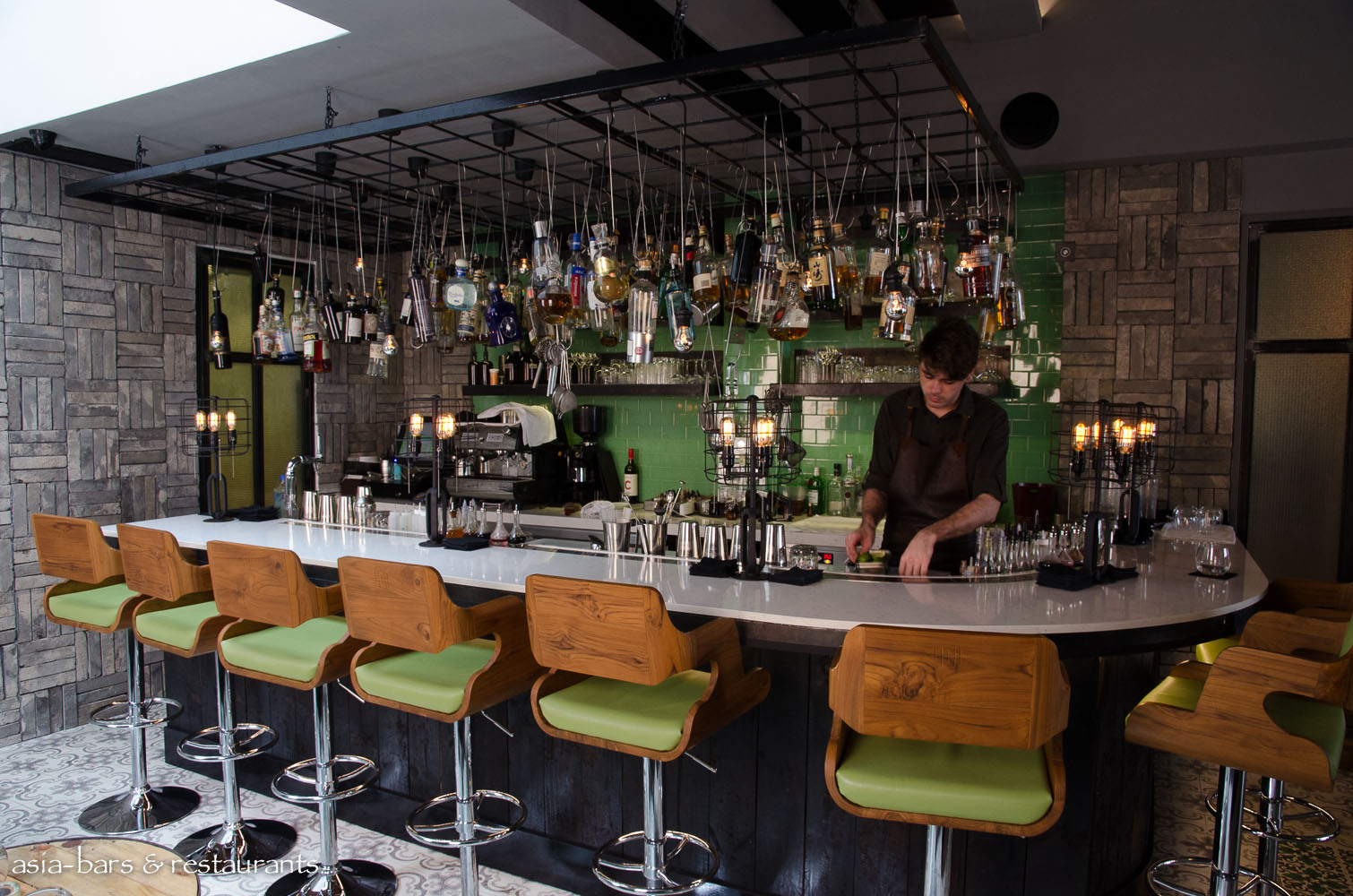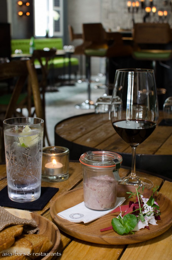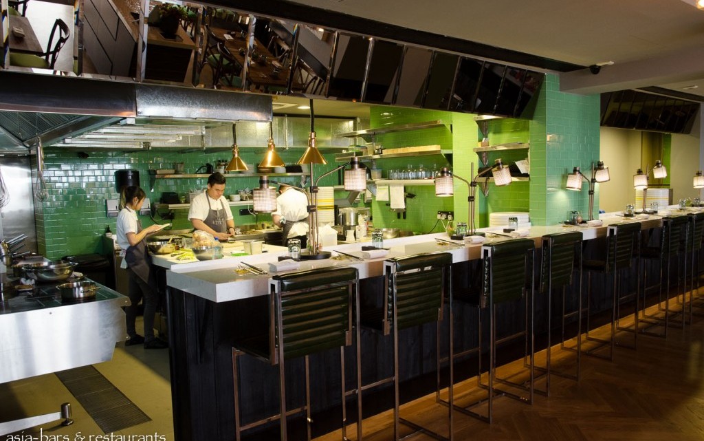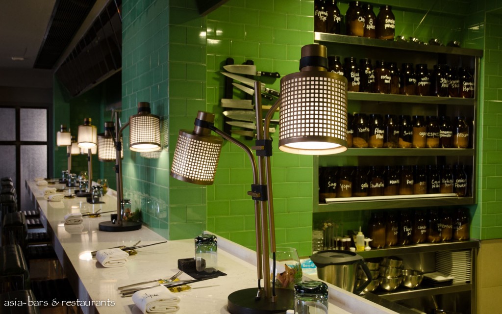 Whilst retaining elements of the industrial-chic aesthetic of the original restaurant, the design of the new restaurant adopts a fresh, contemporary chic approach. Designed in collaboration with New York architect Alan Barr and his Singapore-based design firm greyMatters, the decor utilises a palette of citrus and pastel green materials to contrast pleasingly with the unorthodox wall panelling of charred wood, and together with parquet oak flooring, creates an atmosphere of a laid-back comfort and elegance. Rustic reclaimed timber tables in the bar space sit perfectly with the citrus green leather banquettes. While at the corner bar, the white marble counter is faced with more of the charred timber panels- overhead the array of hanging bottles evoke the original Tippling Club bar. An upstairs space will open in early 2014 featuring a tasting kitchen and chef’s laboratory- showcasing the cutting edge cuisine in an intimate setting for up to12 diners.