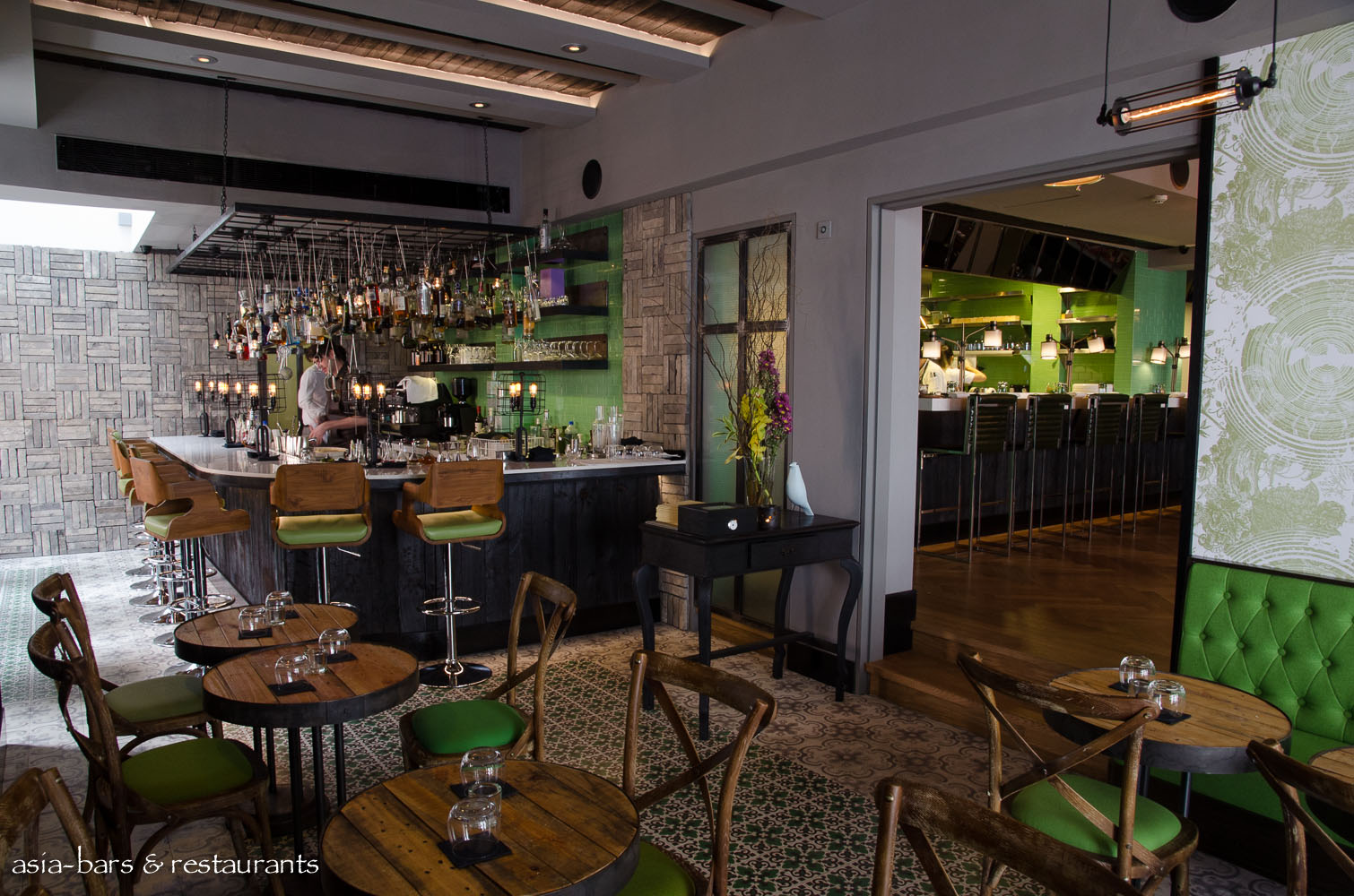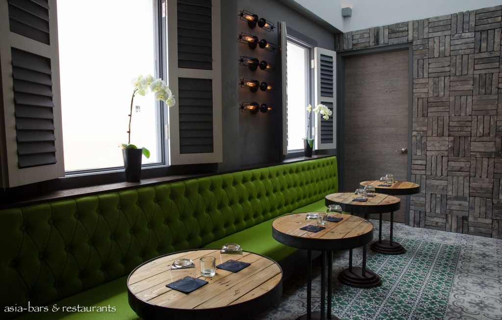 Occupying one of the original three shophouse spaces- the cocktail bar exudes a relaxed sophistication- hand-painted decorative ceramic floor tiles contrast with the oak parquet flooring in the dining room- delineating the two spaces.