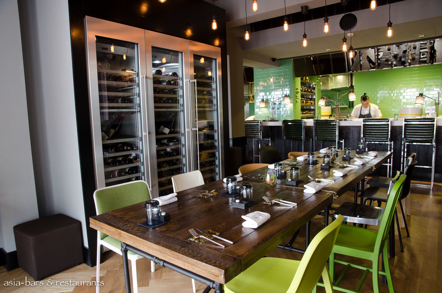 An elegant citrus-green leather banquette setting spans the wall opposite the bar. Rustic tables are crafted from reclaimed timber on black steel bases.