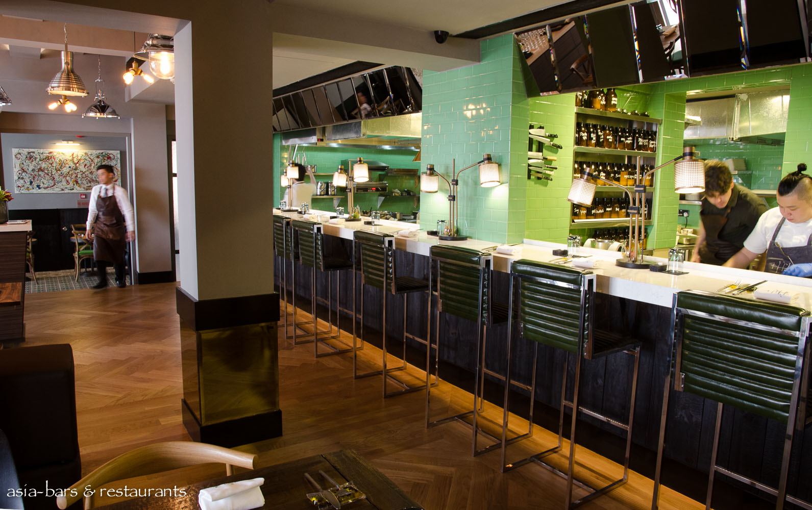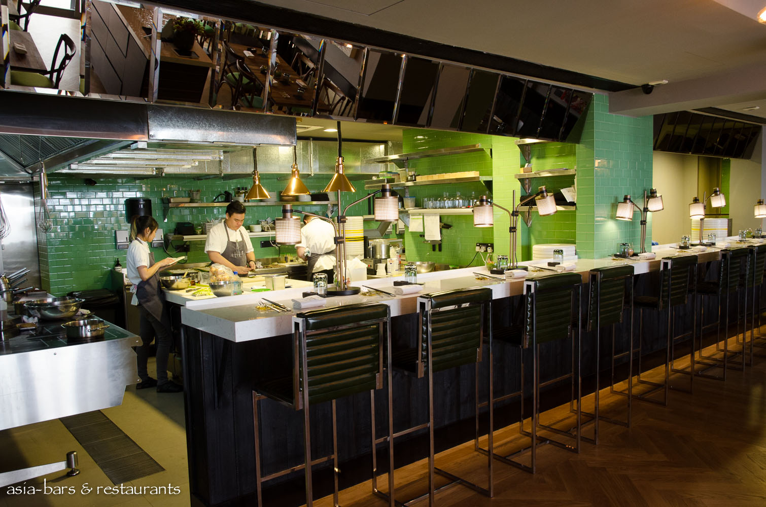 The gleaming new open kitchen spans the rear portion of the double-width dining room space. A long dining counter seats guests opposite the culinary team in the kitchen.