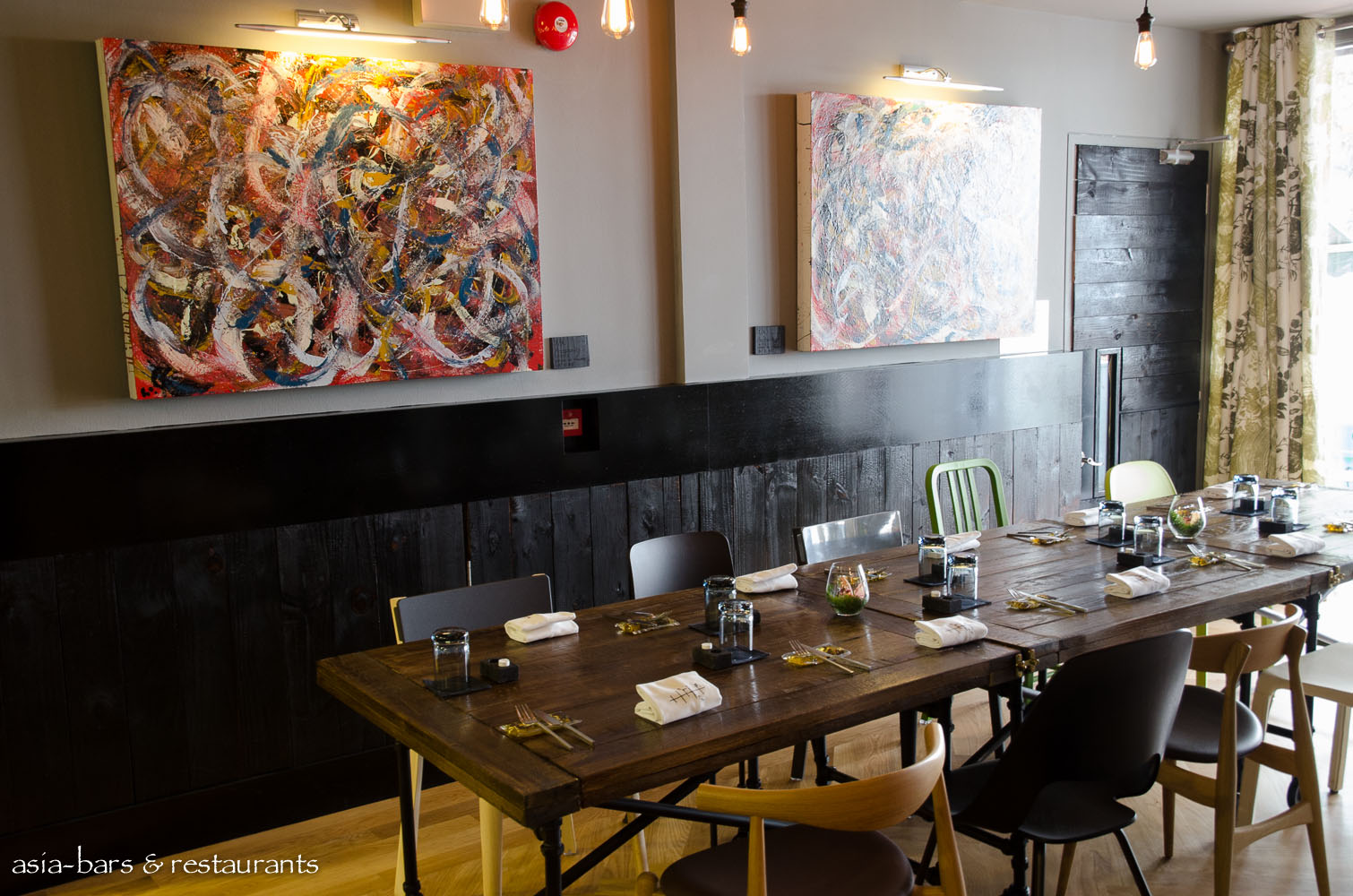 Dining room decor features reclaimed timber tables with mis-matched chairs. Internal walls are partially panelled with a traditional Japanese technique utilising charred timber.