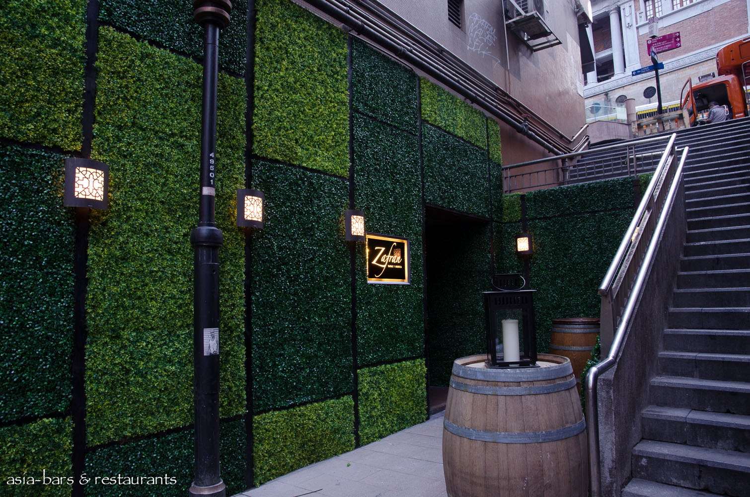 Accessed down a series of steps from Wyndham Street- the distinctive “garden” facade, oak wine barrels, and candle-lit lamps mark the “underground” entrance to Zafran.