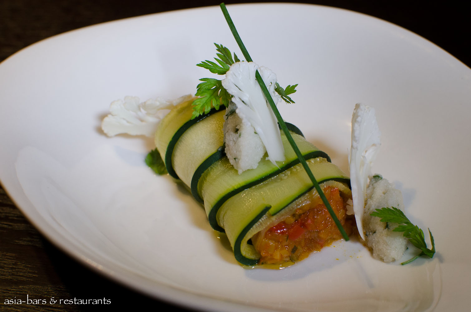 Pisto couscous- Spanish ratatouille wrapped in zucchini with cauliflower couscous.
