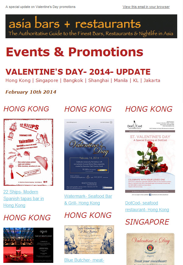 VALENTINE’S DAY 2014- Latest Dinner Promotions VALENTINE’S DAY 2014- Latest Dinner Promotions Asia Bars & Restaurants Newsletter # 2 February 10th, 2014 Click here to view the complete Newsletter See also February 3rd Valentines newsletter Share article: Google Plus 0 Share 0 Tweet 0