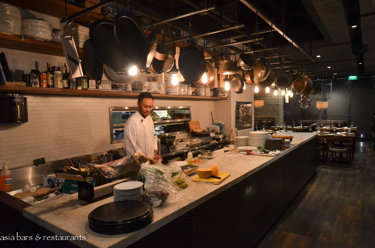 A substantial white marble serving counter extends across the front of the kitchen- connecting diners with the Bedrock culinary team.