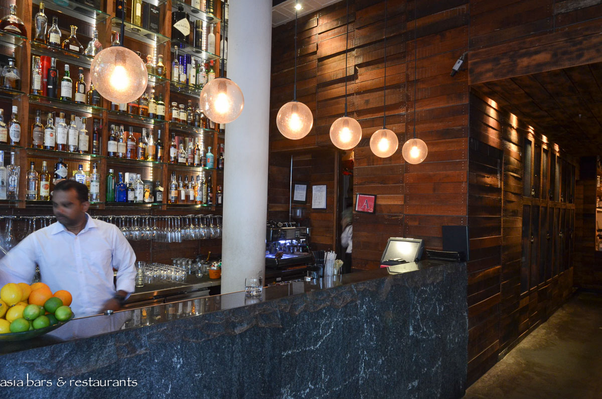 A sleek black granite bar greets guests at the entrance to Bedrock- providing a visual contrast to the rustic, timber-planked passageway leading to the main dining room.