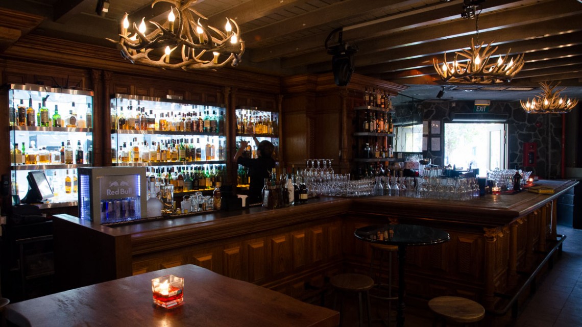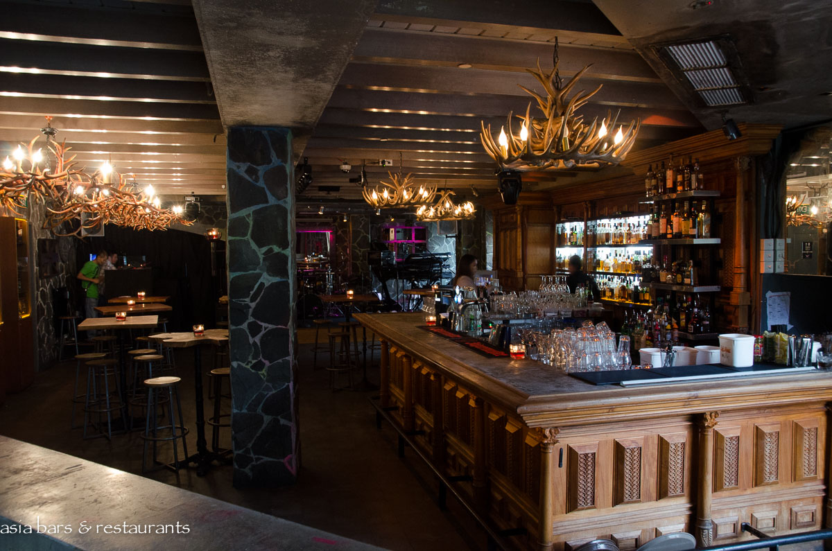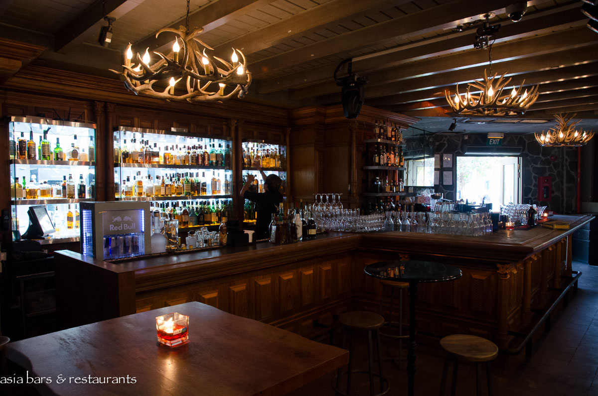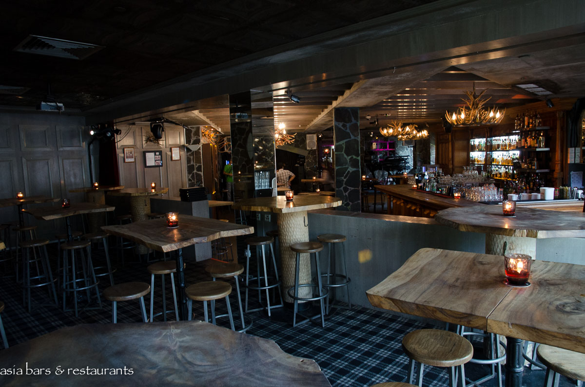 The solid timber bar extends across the front side of the interior. Antler chandeliers suspended from the ceiling add an emblematic Scottish element.