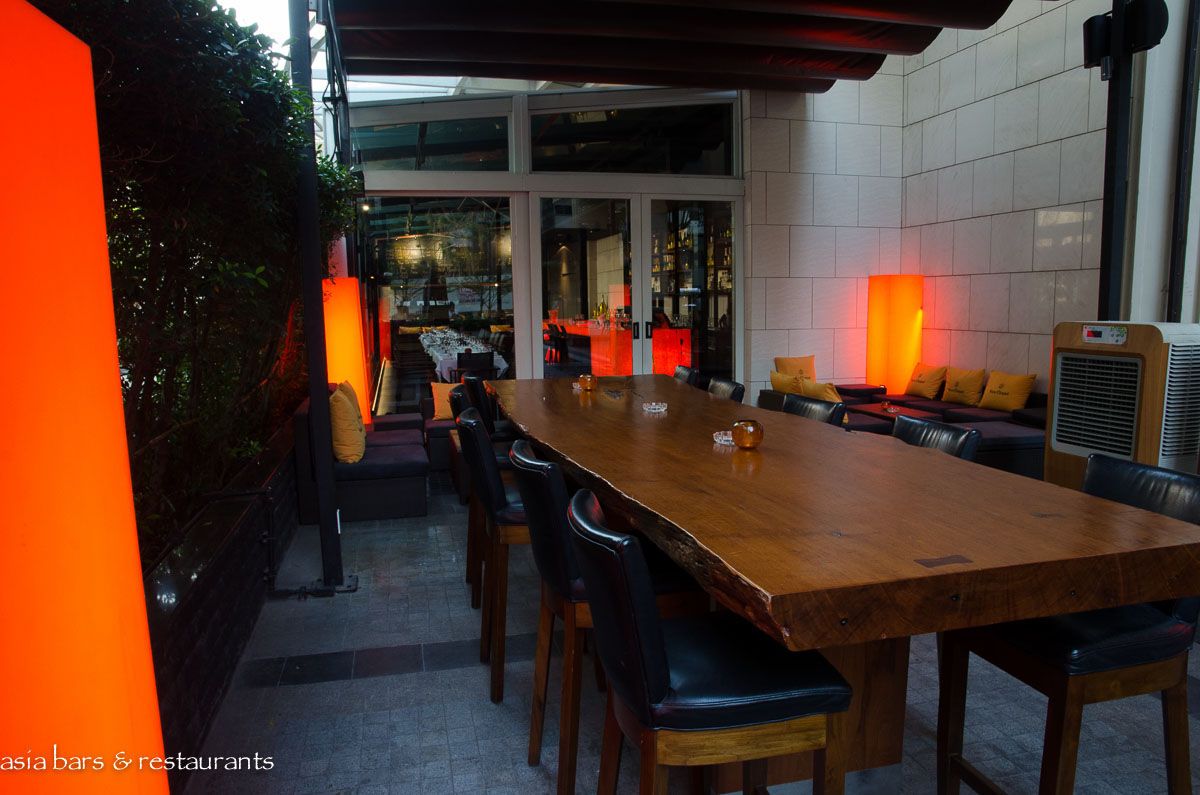 An open-air section at the entrance offers seating both at a high communal table, and comfortable sofa settings.