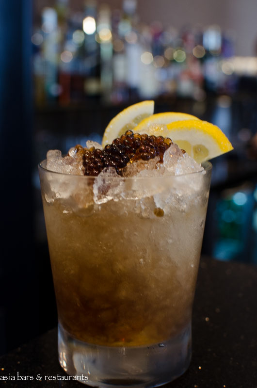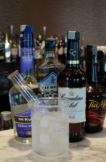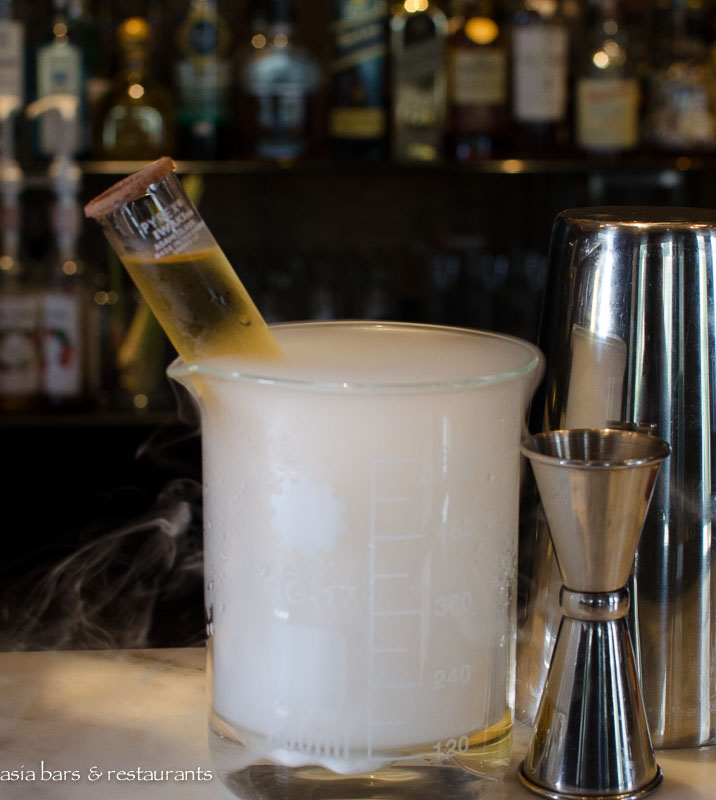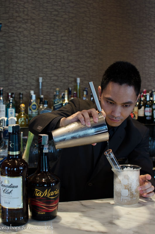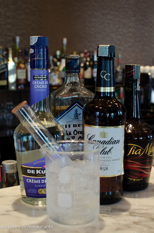 Creative mixology headlines the beverage program at Kemixtri. A concise list of signature cocktails are crafted utilising molecular mixology techniques, exemplified by the aptly titled “The smokey”– an intriguing combination of Rye Canadian whiskey mix with vodka infused with coffee bean and orange skin, crème de cacao white, Tia Maria and a hint of vanilla syrup, served in two separate tube with smokey dry ice. The house specialty are vodka infusions using local spices and ingredients such as red chilies and pandan leaves. For the traditionalists, and less adventurous, well-executed classic cocktails such as Negroni, Dry Martini, Mojito, and Manhattan complement the molecular cocktails. A broad selection of wines, single malts and premium spirits are also served.