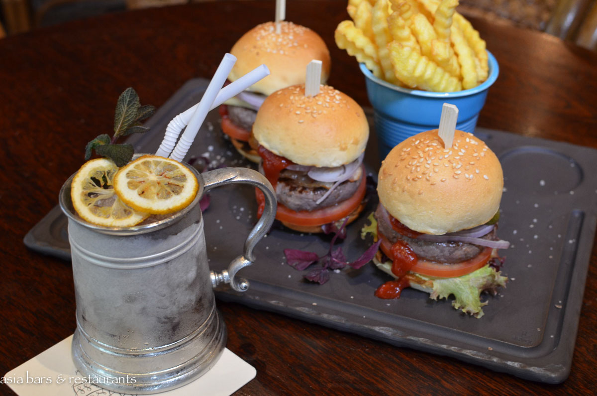 Paired with Long Bar Sliders– three mini burgers- plain, cheese & bacon. Served with fries.