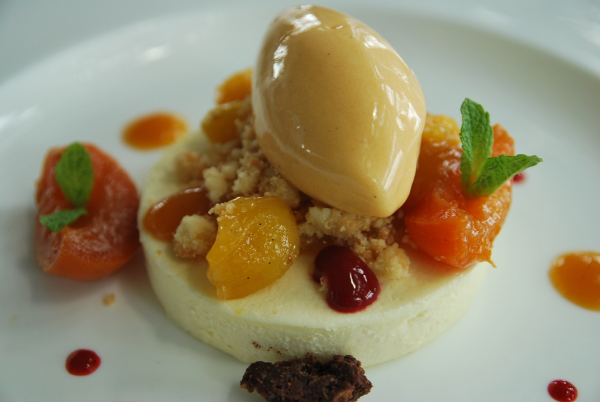 Semifreddo alla mandorla amara- fondant textured almond parfait with apricot sorbet