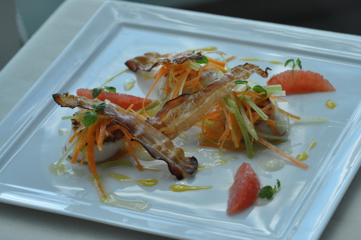 Capesante Scottate- seared scallops with citrus salsa, crisp salad and crisp pancetta