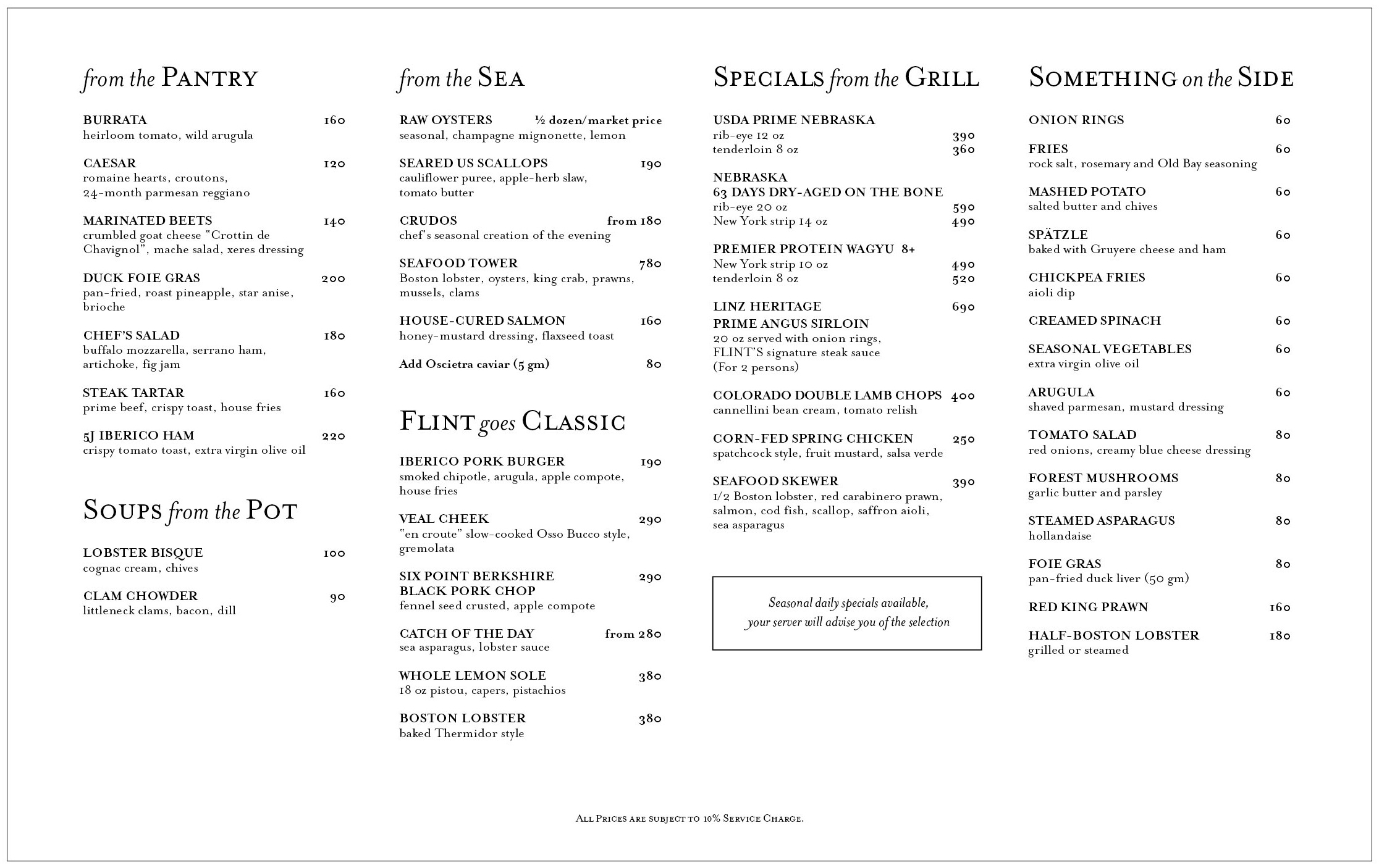 Under the direction of internationally experienced Head Chef Sven Wunram- the Flint culinary team are cooking a well-constructed menu that features authentic classic bistro dishes plus the Flint specialty- modern grill cuisine. Signature dishes include “Nebraska” 63 day dry-aged on the bone range of premium artisanal beef cuts (Rib-Eye 20oz / NY Strip 14oz) all served with Flint Grill & Bar’s house signature steak sauce; and Seafood Grill comprising Catch of The Day, half Boston Lobster, Red King Prawn and a pot of Mussels.