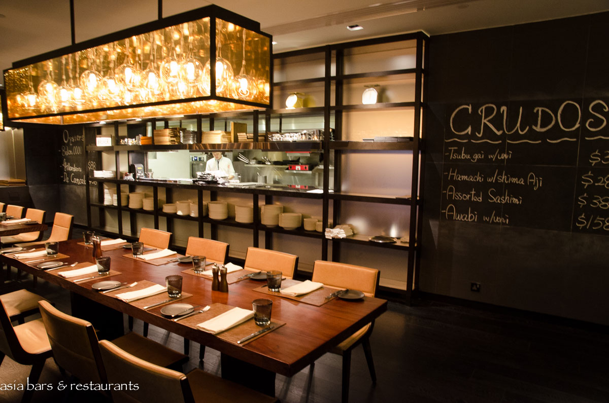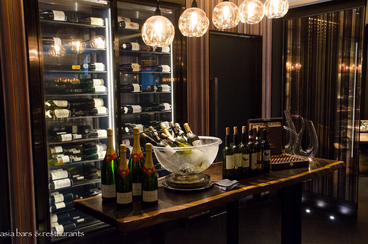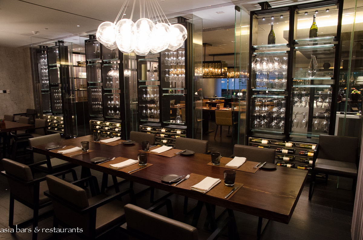 Taking design cues from a residential theme, a series of distinct spaces interconnect seamlessly- with guests at arrival first encountering the striking cocktail bar and lounge, followed by the wine sommelier’s table, and then into the main open-plan dining space. Within the main dining area, several sections offer a variety of dining experiences- adjacent to the open kitchen two chef’s tables provide an immersive, interactive dining experience, whereas two elegant private rooms- set behind glass encased, floor-to-ceiling wine and glassware showcases- provide a discrete and refined dining environment for intimate groups of eight diners each.