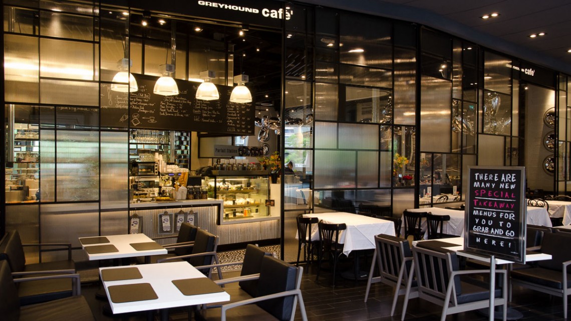 Located on the first floor, Greyhound Cafe is open all day from 11 am in the morning through to 10 pm at night. Seating in the main cafe space is at generously spaced tables and black leather banquette settings, with additional casual seating available in the outside terrace area across the facade.