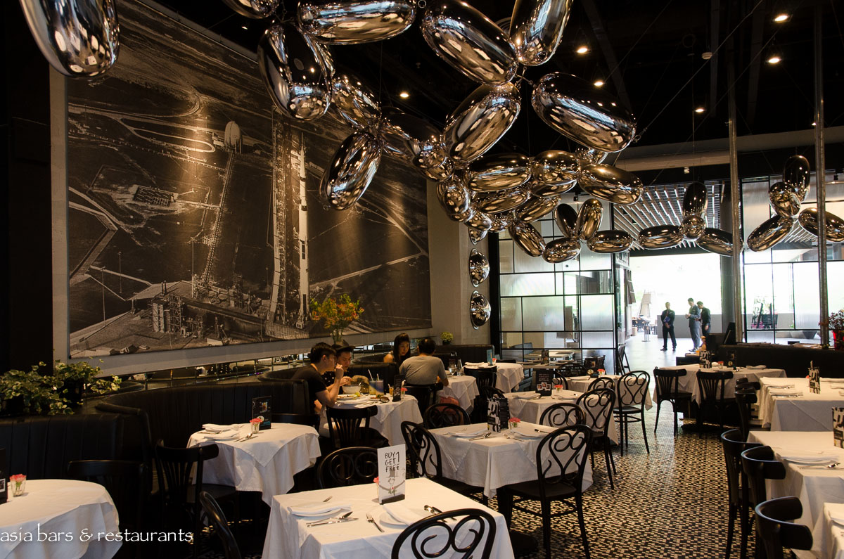 In designing the new cafe interior, Greyhound have embraced the concept of “Art Space” – blending distinctive art installations with an “outer space” theme- superimposed onto the hallmark “Greyhound” industrial chic design aesthetic. A specially commissioned giant mobile installation of chromed, interconnected “balloon art” shapes dramatically suspend from the ceiling. And channeling the space theme- the main internal wall is covered by a massive photographic mural of the Apollo 11 spacecraft standing on its launchpad.