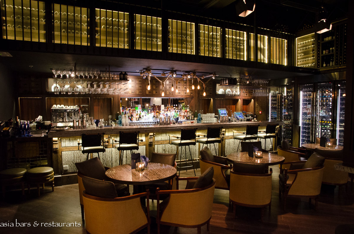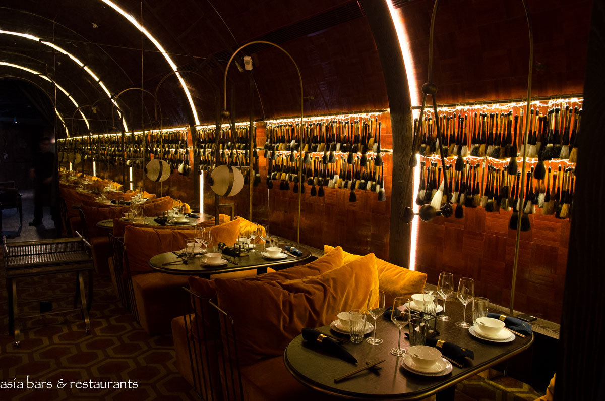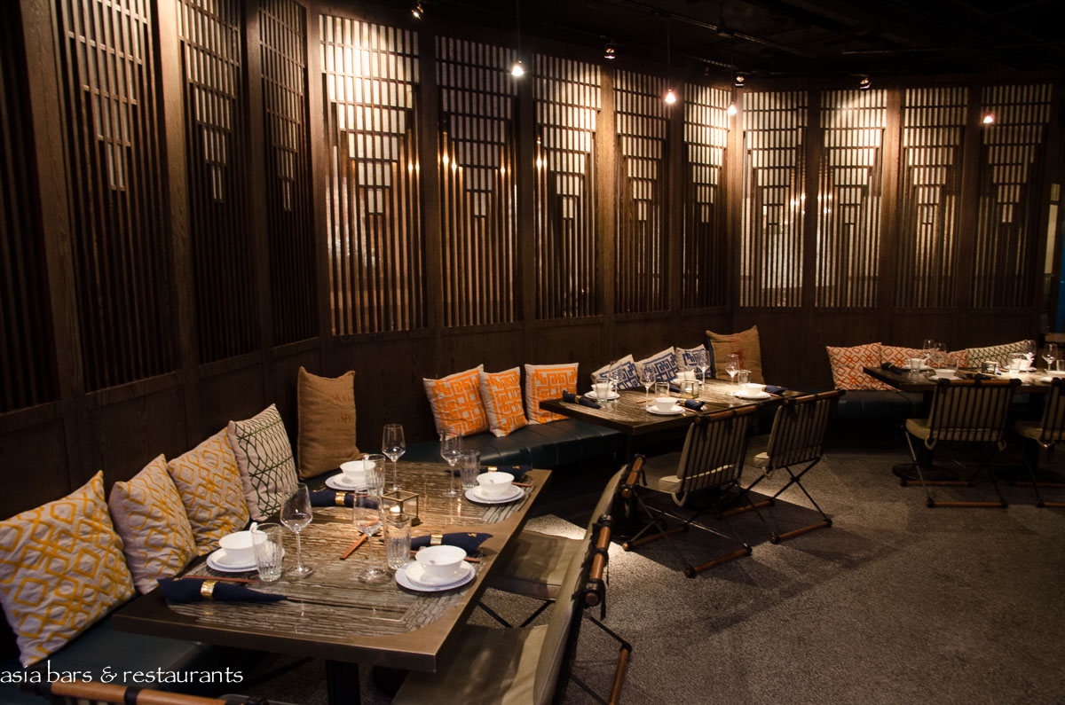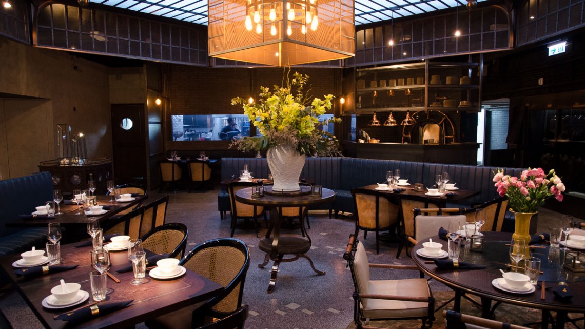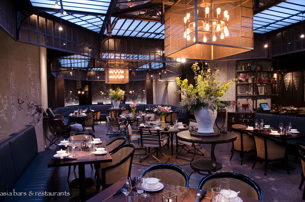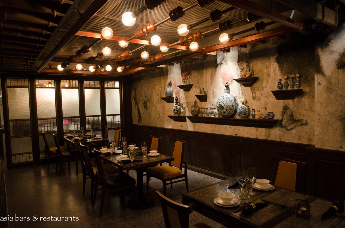 Acclaimed local designer Joyce Wang was engaged to execute a cross-cultural concept that harmoniously merges a classic, yet understated Chinese aesthetic with elements that evoke the industrial grit of New York’s late 19th Century. Muted colour and material palettes of dark browns, black, and grey unfinished concrete surfaces are complemented with plush soft furnishings, antique Chinese ornaments, and refined traditional table settings. Combined with comfortably subdued lighting, an atmosphere of sultry sophistication exudes the impressive space.