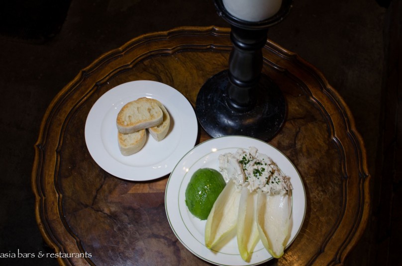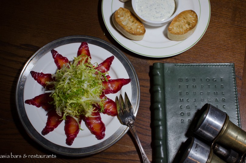 Stockton is the latest in a series of impressive restaurant openings from Maximal Concepts– each idiosyncratically themed, including the adjacent Fish & Meat, Mott 32, Blue Butcher, and located in a secluded Lan Kwai Fong lane- Brickhouse. Occupying a comfortably roomy space, the Stockton interior is anchored by the handsome solid wooden bar extending across the back wall, with a series of plush sofa and low table settings in the main room, and several private spaces set into alcoves. With capacity limited to 120 guests, ensuring a discrete and sociable experience for all patrons, bookings are strongly recommended- both for dinner- and late night drinks.