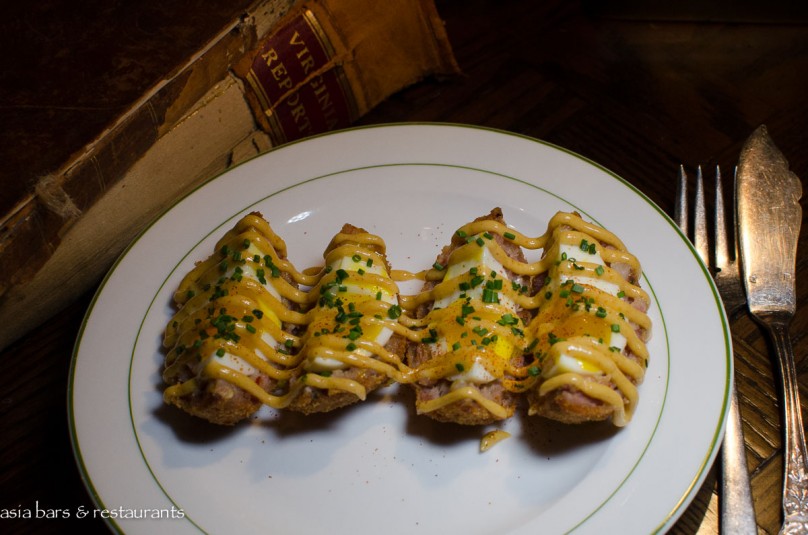 Leather-bound cocktail menus list the thoughtfully researched selection of cocktails that are inspired by the libations popular with affluent 19th Century Londoners. Mostly based on the fashionable spirits of the time- dark Caribbean rums, Scottish whiskies, and English gins- each cocktail description includes notations outlining the historical background behind the concoction. At the impressively stocked bar, over 150 labels of whiskies are showcased- with other spirits selectively barrel and leather aged in house. Another specialty of Stockton is their selection of small, family produced champagnes that offer some appealing alternatives to the familiar mainstream champagne houses.