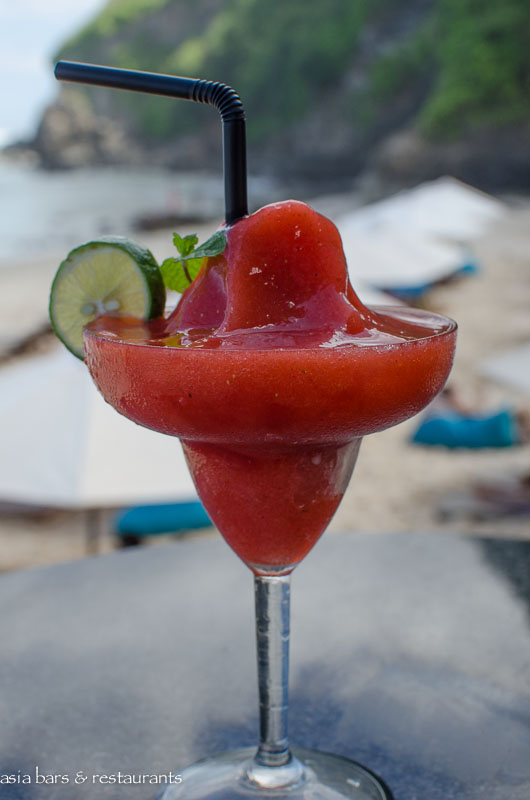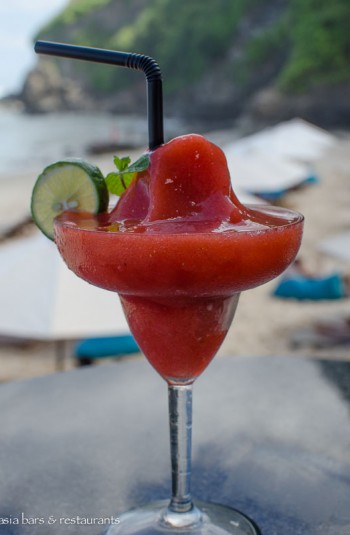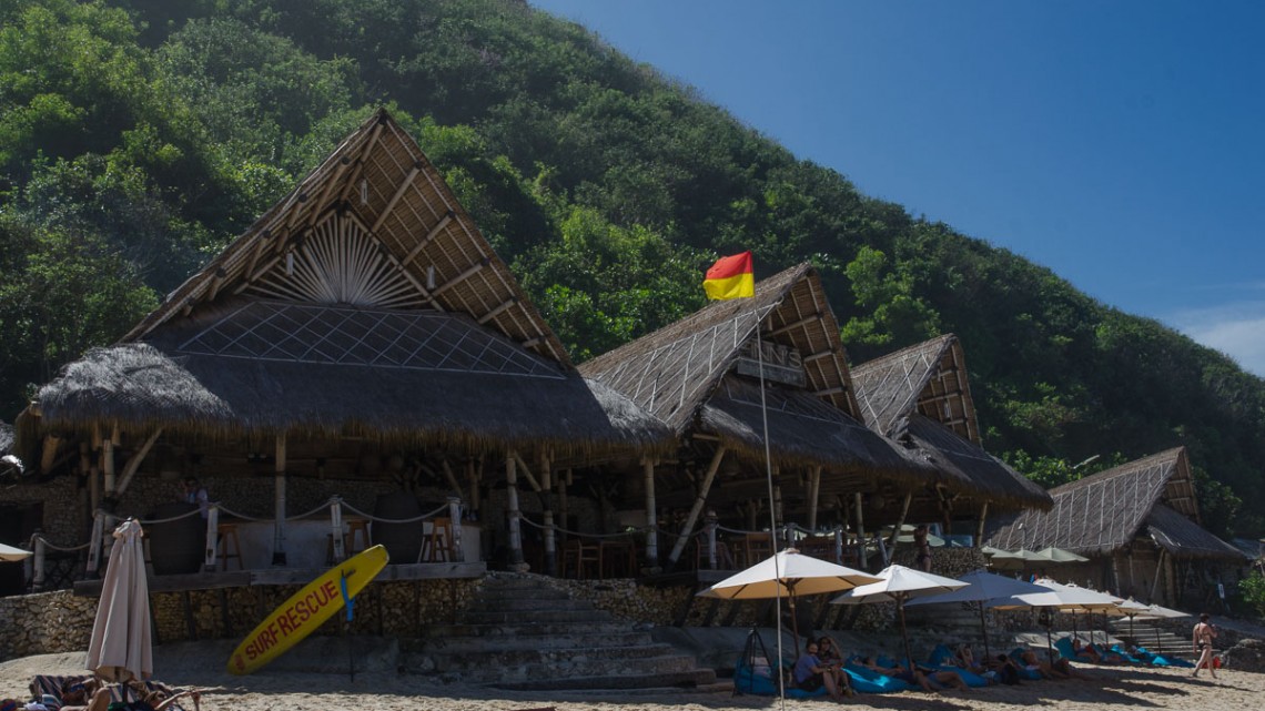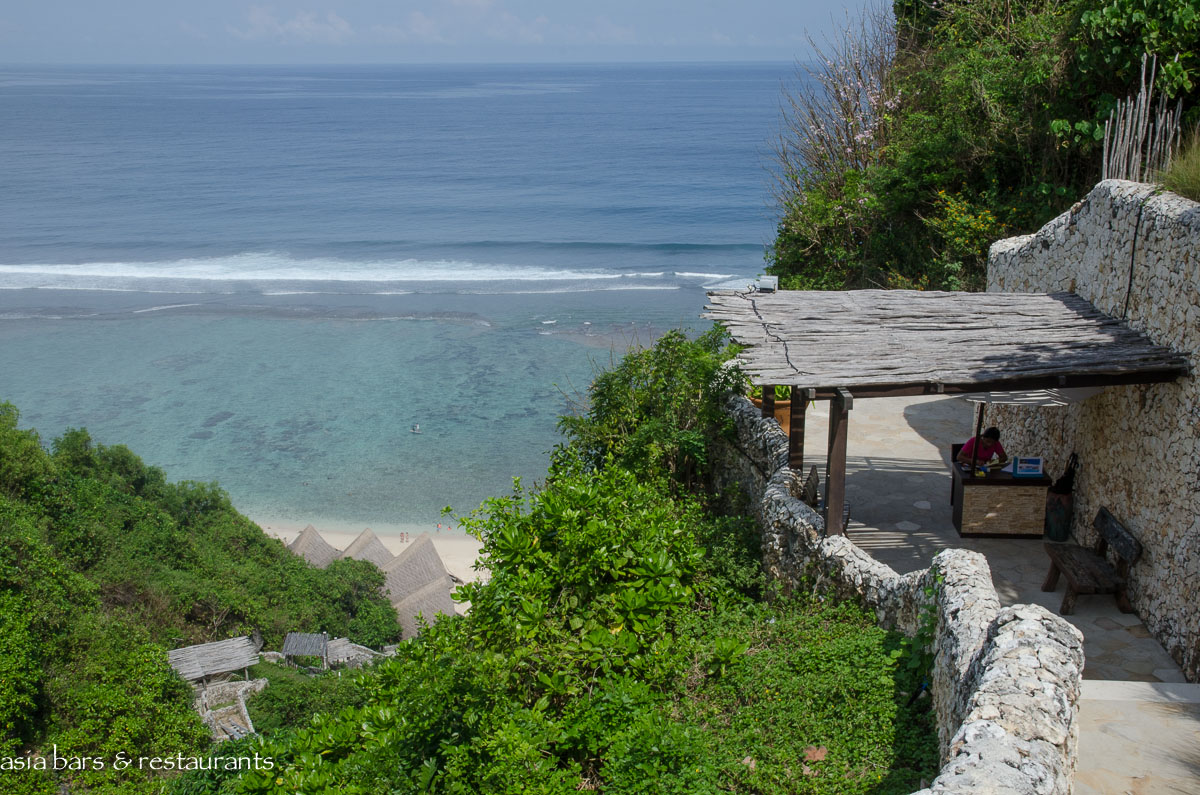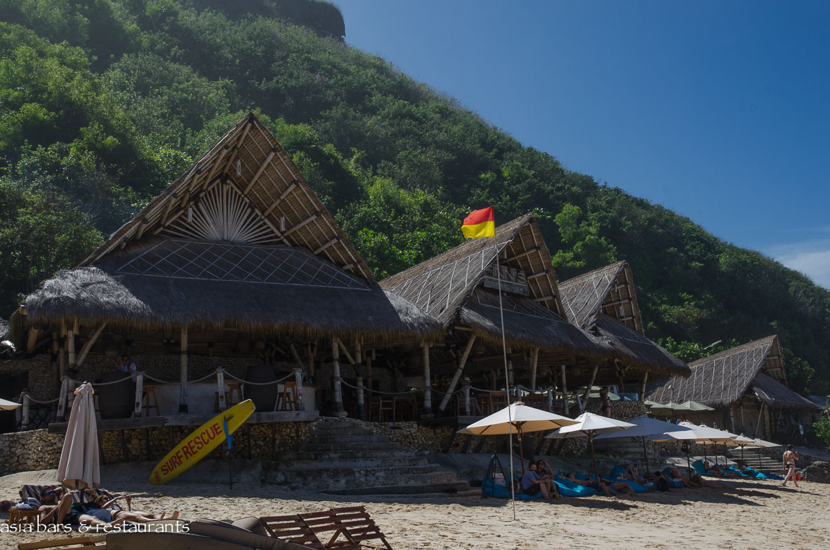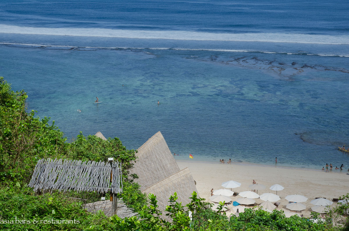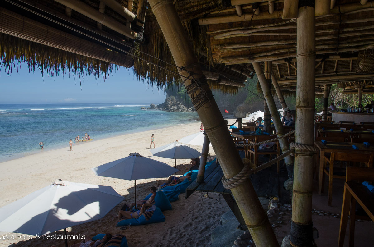 Accessing Finn’s from the cliff top at Semara Villas, guests descend almost vertically down the 70 metre cliff face on the private inclinator- a brief but spectacular ride that reveals the stunning setting. Blending harmoniously with its beachfront location, the main structure of Finn’s is constructed from white limestone rock and local bamboo timbers, with Balinese-style soaring thatched roofs. The facilities include the main open-air restaurant and bar, a terrace section of day lounges with umbrellas, and the beach-side umbrella settings- with a choice of bean bags or timber sunbeds. Two private Tree Top Bales are available for booking- the Spa Bale for private massage treatments, and the Private Lounge for small groups of up to six guests.