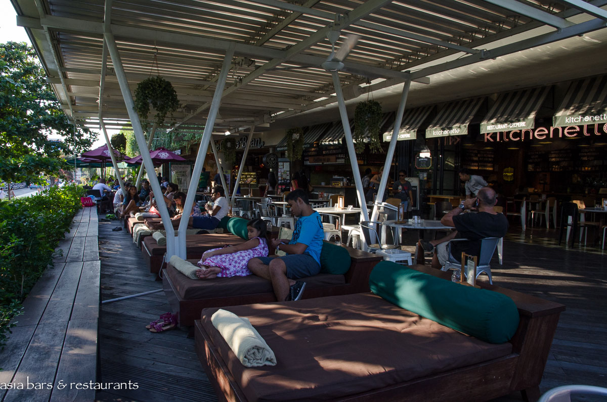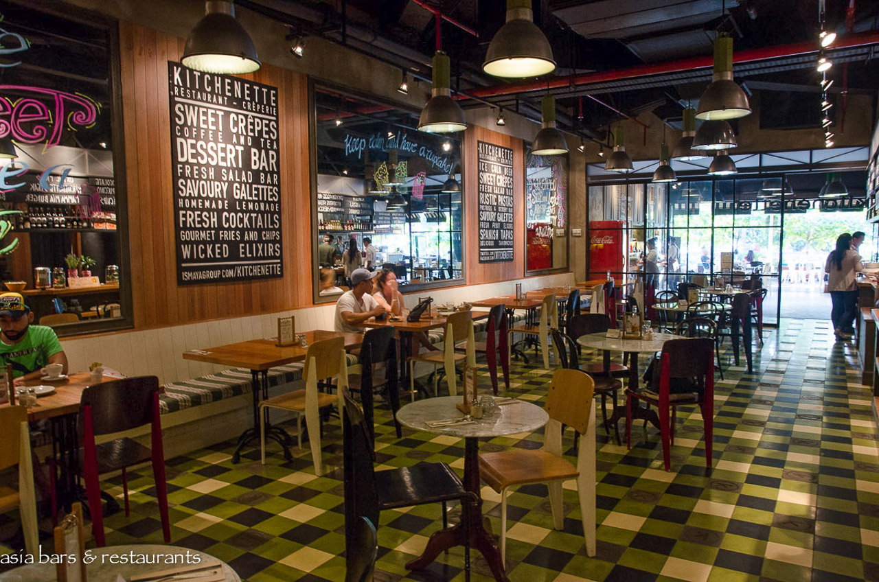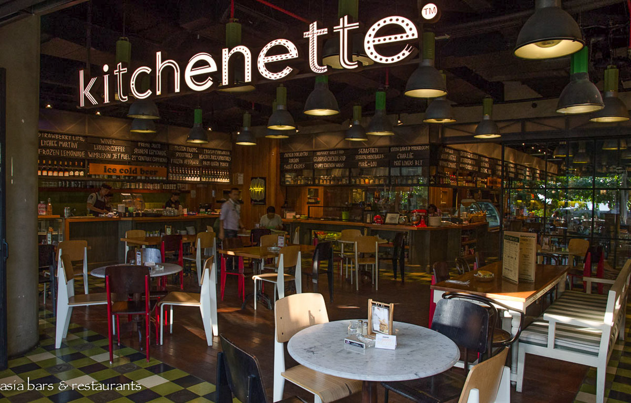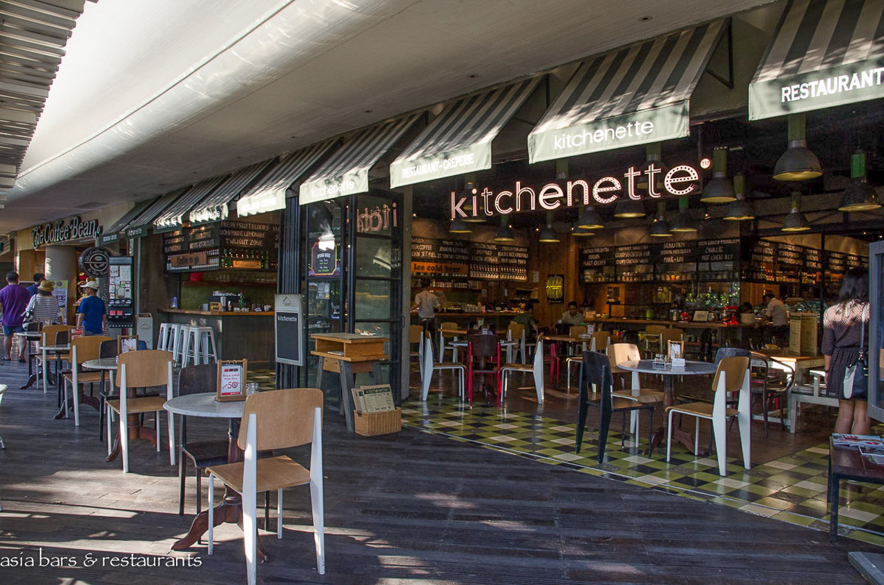 Accordant with its Kitchenette title- and concept of home-style cooking- the decor has a distinctly kitchen-themed direction with cooking utensils and kitchen accessories deployed extensively as decorative features, and the compact open kitchen connects patrons with the cooking team. The elongated interior space features several sections of casual cafe tables and banquette settings, back- dropped with oversize wall mirrors and menu chalkboards. At the promenade frontage- open air tables and daybeds on the terrace offer ideal people watching opportunities.