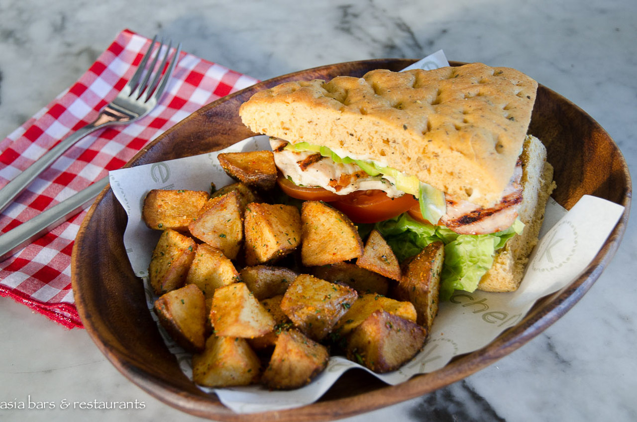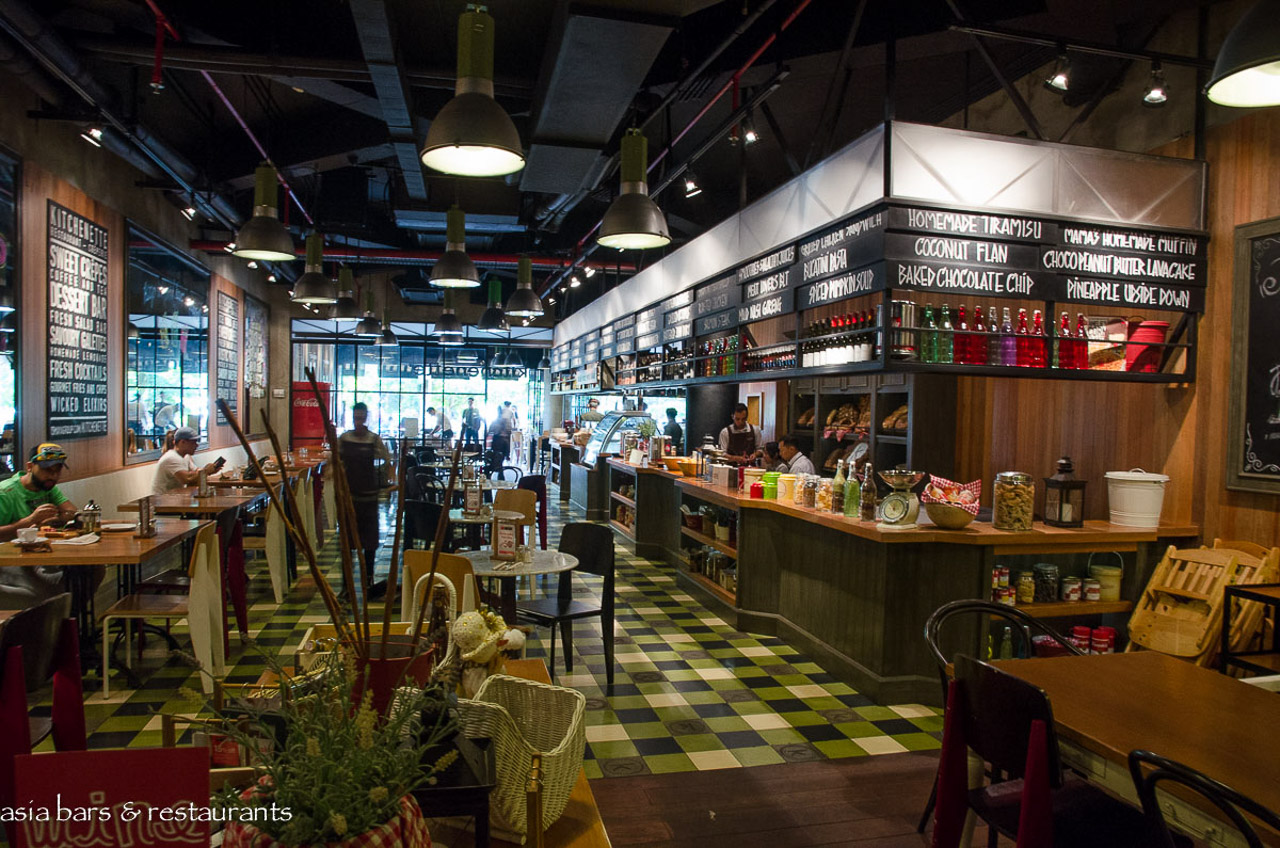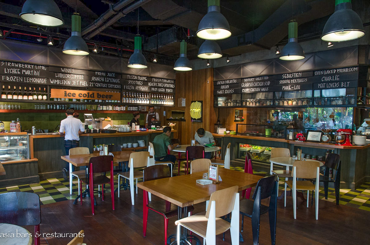 Accordant with its Kitchenette title- and concept of home-style cooking- the decor has a distinctly kitchen-themed direction with cooking utensils and kitchen accessories deployed extensively as decorative features, and the compact open kitchen connects patrons with the cooking team. The elongated interior space features several sections of casual cafe tables and banquette settings, back- dropped with oversize wall mirrors and menu chalkboards. At the promenade frontage- open air tables and daybeds on the terrace offer ideal people watching opportunities.