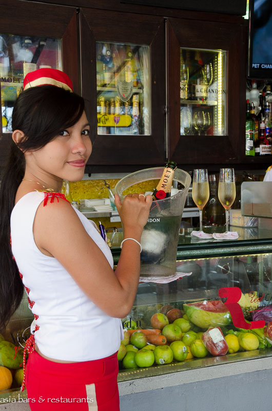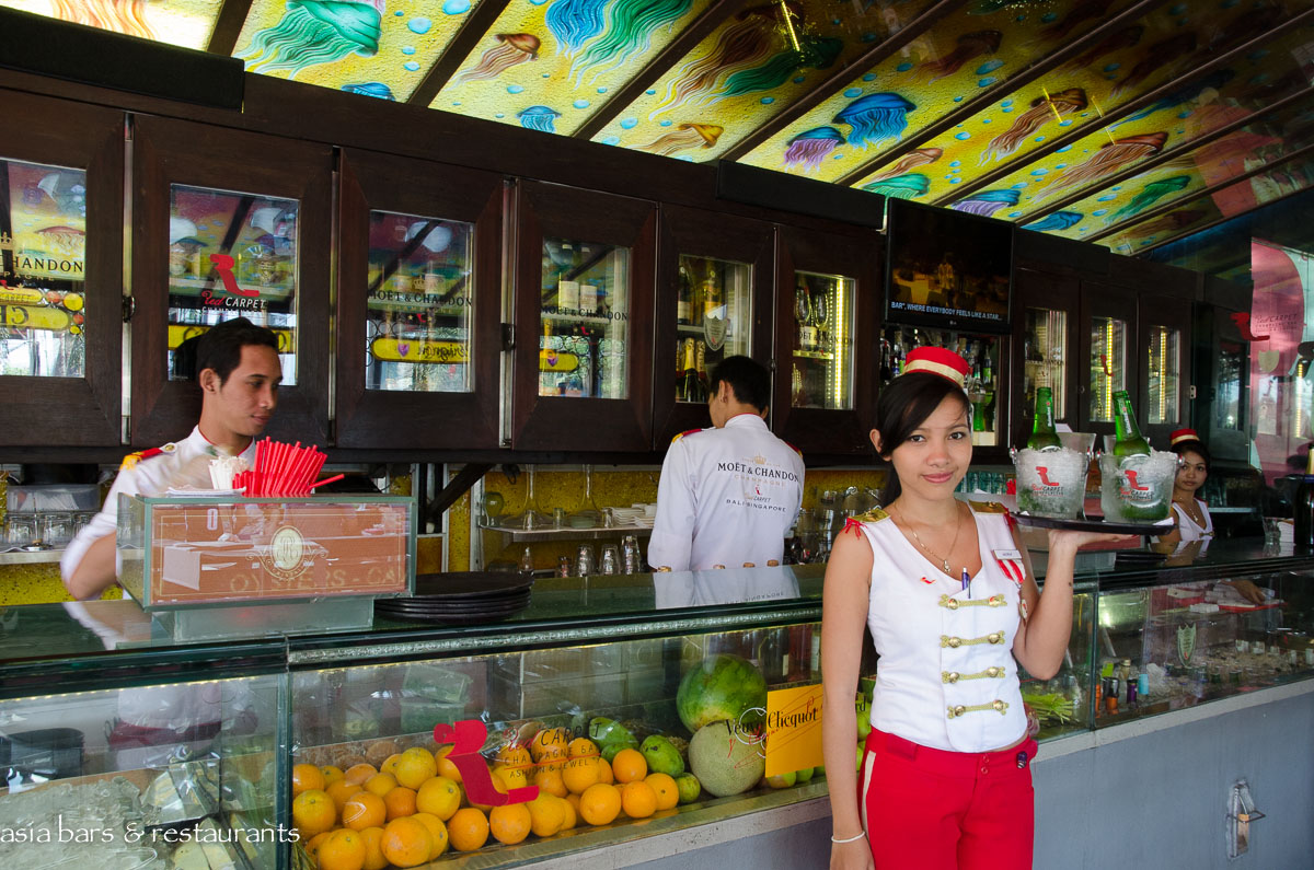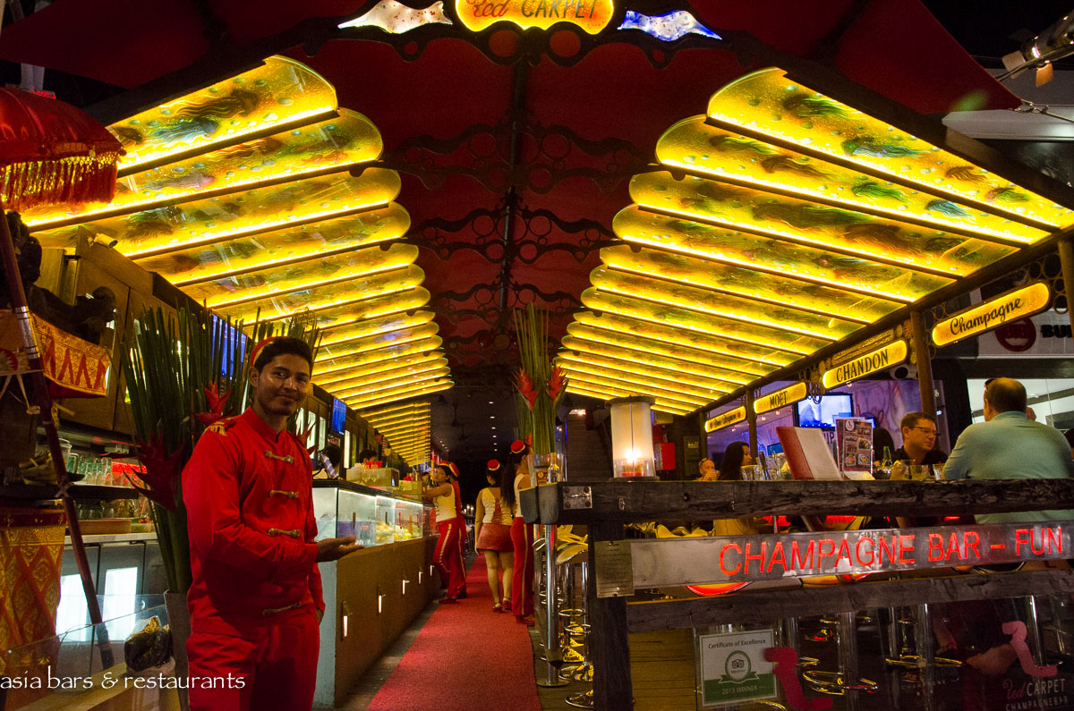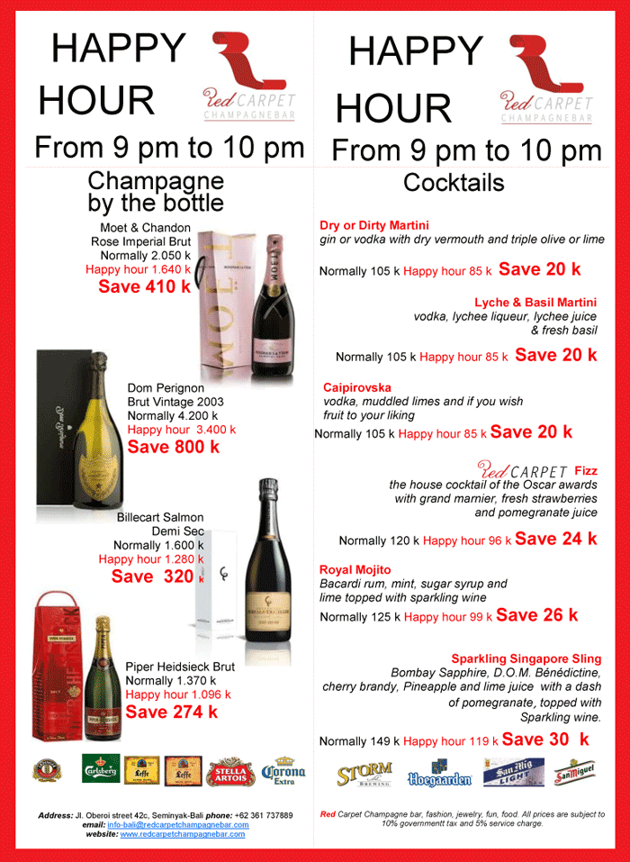 Consistently popular, Red Carpet Champagne Bar has been a prominent fixture on Seminyak’s nightlife scene for nearly 5 years. A compelling combination of glamour, champagne, convivial atmosphere, spiced up with a touch of sexiness- Red Carpet attracts a vibrant crowd of both local expats and visitors most nights. The synonymous red carpet spans the 24 metre length of the main bar, and welcoming staff clad in retro bellhop uniforms greeting guests at the pavement side entrance evoke the “celebrity” experience. An outstanding list of over 100 champagne labels headlines the drink list. Famous labels such as Moët Chandon and Veuve Clicquot are complemented by exclusive rare vintages of the premier champagne houses, plus other sparkling wines and prosecco at approachable prices. Moët Chandon is also served by the glass as the ” house champagne”.