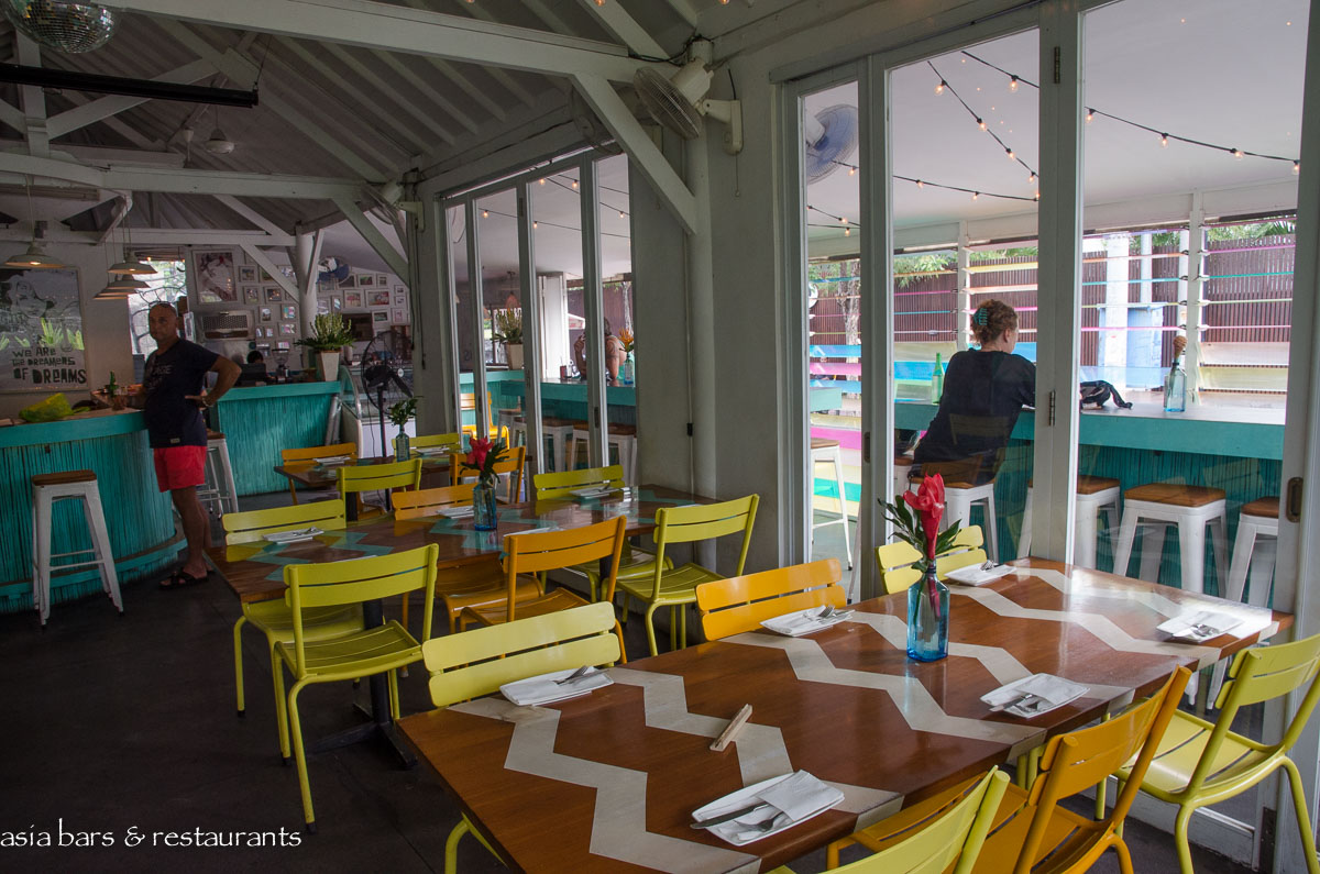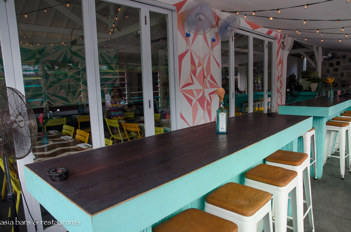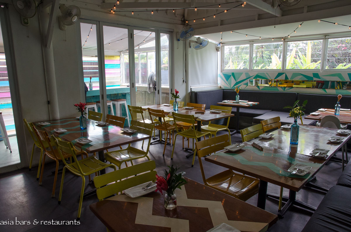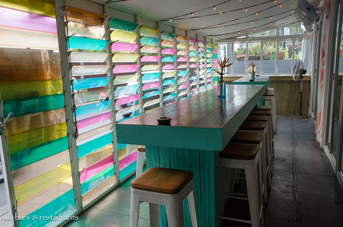 Embracing a beach shack chic design aesthetic, the interior is splashed with vibrant colors on the white-washed walls, with plenty of glass to flood the interior with natural daylight. The compact space includes a front section with communal seating at two substantial high benches that overlook the street through the colored glass louvres; the main cafe space that seats around 30; and a bright turquoise colored bar and serving counter that wrap around from the entrance.