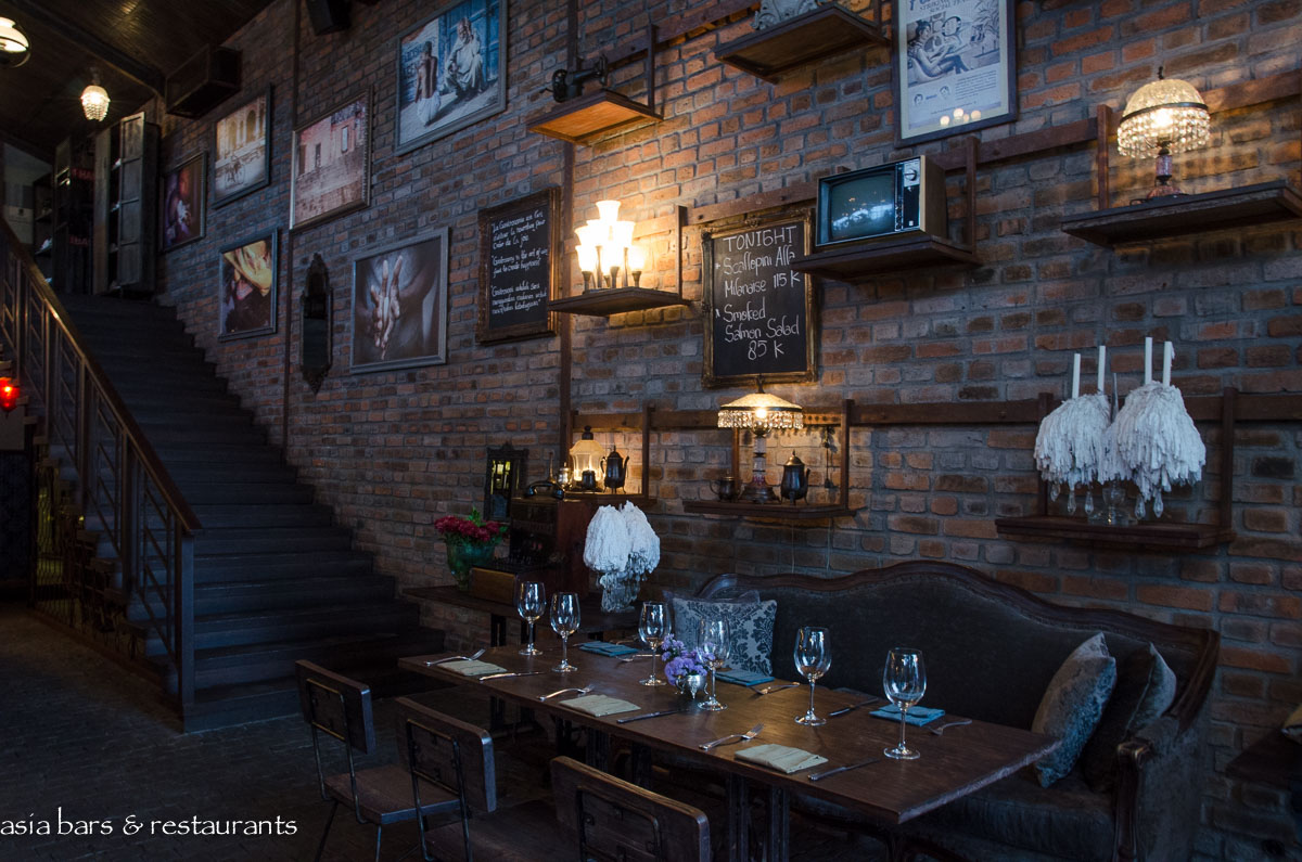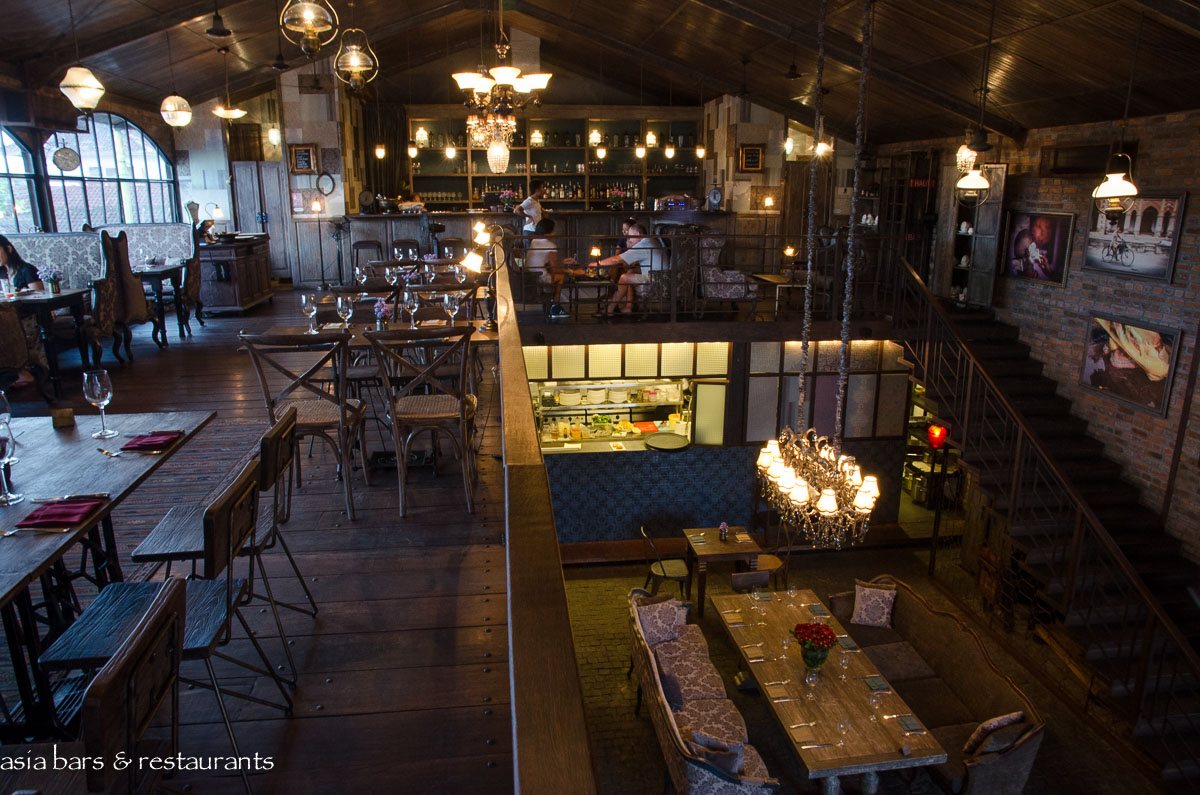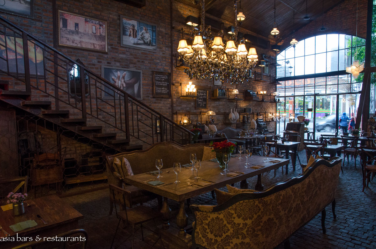 Remodeling the industrial shell of the voluminous former commercial showroom, the design team have retained the raw brick walls, steel framed glass facade, and wonderful timber paneled ceiling. The interior has been refashioned into an elegant dining space that deftly combines rustic utilitarian cafe furniture with glamorous reproduction sofa settings. Impressive chandeliers contribute additional glamour. The main ground floor space- paved with black basalt stone- functions as the main restaurant, with the semi-open kitchen set at the rear of the room. An eclectic abundance of antiques and artifacts are deployed as decorative elements to complement the vintage character of Bistrot.